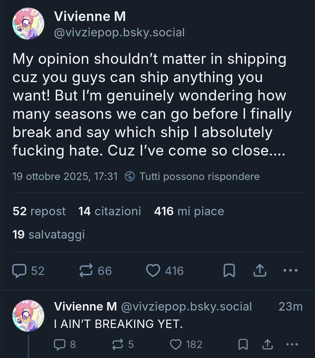 >>151112964>what's that say about her to go on a multi-year crusade against one ship?Vague-tweeting about it once every few years isn't exactly a crusade.>Especially if her first attempt at sinking it ("you're like a daughter to me" bullshitting) completely fell flat and people didn't buy it?Viv's been in the fandom game long enough that she knows you can't stop people from shipping anything or liking a character (she makes Stella merchandise btw). It's not her fault that father-daughter relationships have been so sexualized that she can't write Alastor taking advantage of Lucifer's insecurities over him failing Charlie as her parent without people screaming that it's a Charlastor hint.