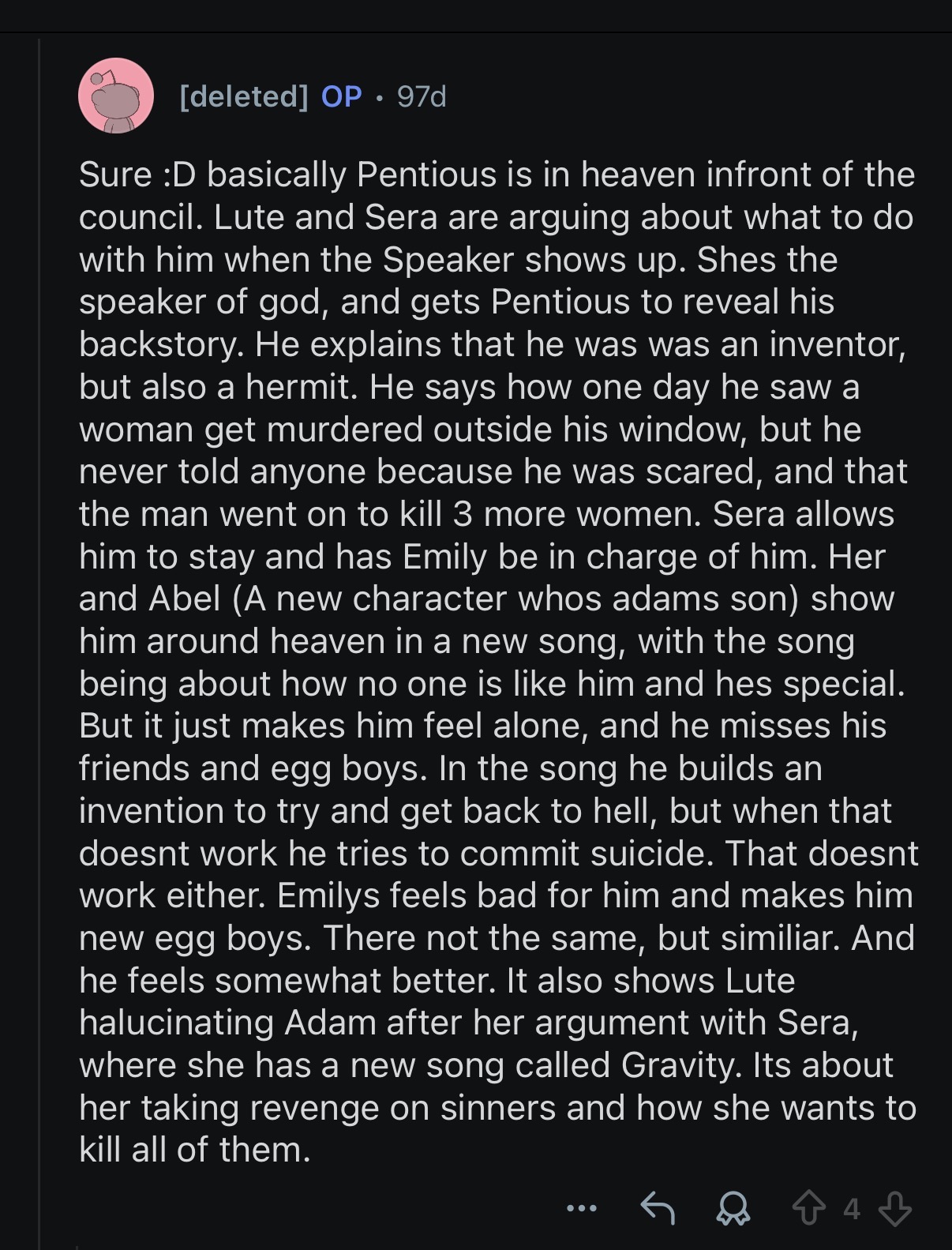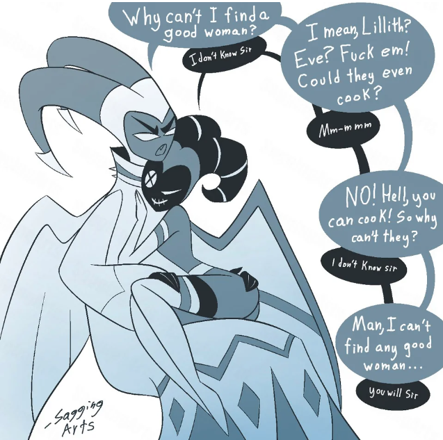>>151108274>>151108156I don’t think Adam is unaware of Lute’s (and his own) feelings, but he is ultimately in this issue of dealing with his evil Wife that badly wants to ruin Lucifer’s life for giving her the Apple and remain on the beach to pretend she’s still in Eden. If Lute connected to Adam back then, Eve would be trying to make this big master plan on ruining Lute’s life too.As petty as this villain is, she is still super evil.