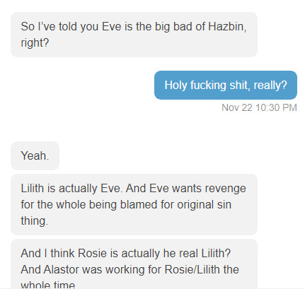 >Woke up not to long ago.>Somehow in the actual show as a human.>Able to use magic to cross into Hell.>I used this to go to the hotel and speak to Charlie, and basically told her that what she's done has put Lute on the warpath and she's gonna murderize her to death.>Also told her she's kind of whiny.>She asked how I know who she is and how I got here. I pull up 4chan on my phone and take a selfie with her to start a thread.>Everyone wants to see her ass.>Or Vaggies ass.>Or Angels tits.>Everyone but Angel hates the attention.>Niffty steals my phone.That's what I get for sleeping with the thread open.