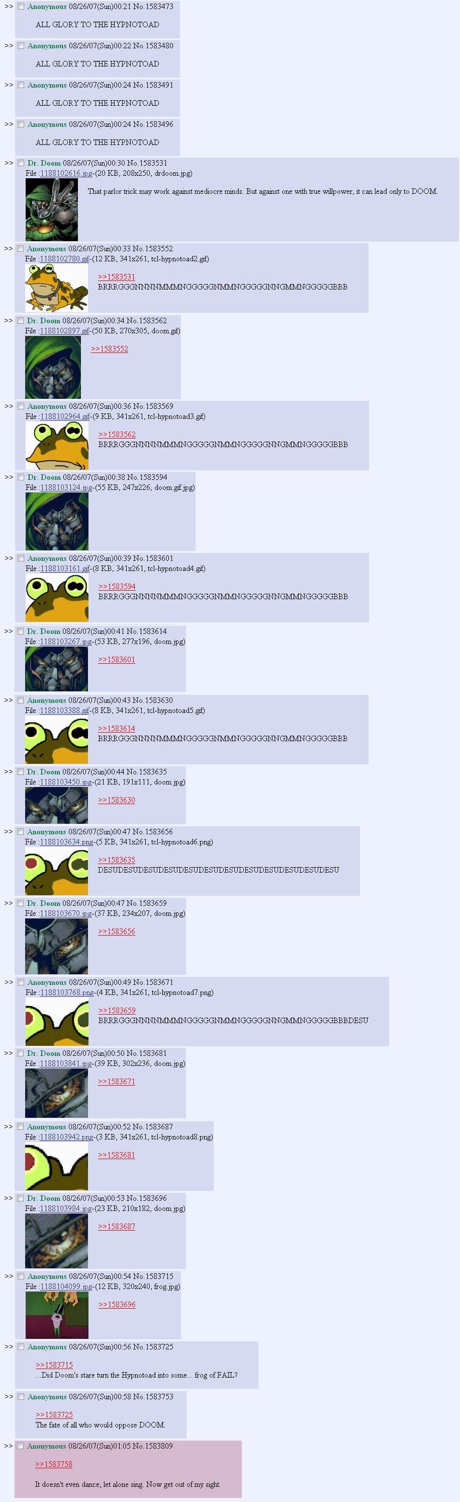 >>151103751>>151104871>>151105423>>151105460>>151105519>>151105617Everytime I see screencaps this old it's so surreal to me. Like are these posters even still alive? Are they okay? Where are they in the world? Do they even visit this website in the present day?