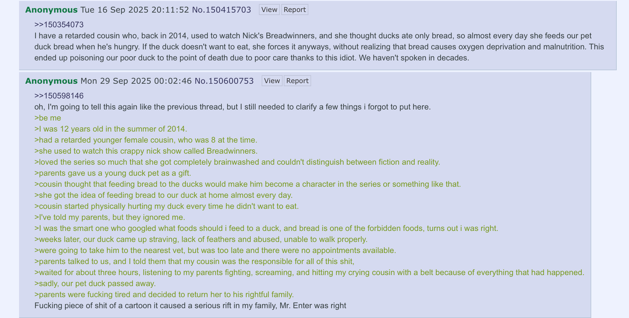 >>151114732Anon's cousin feeds duck bread and murders it