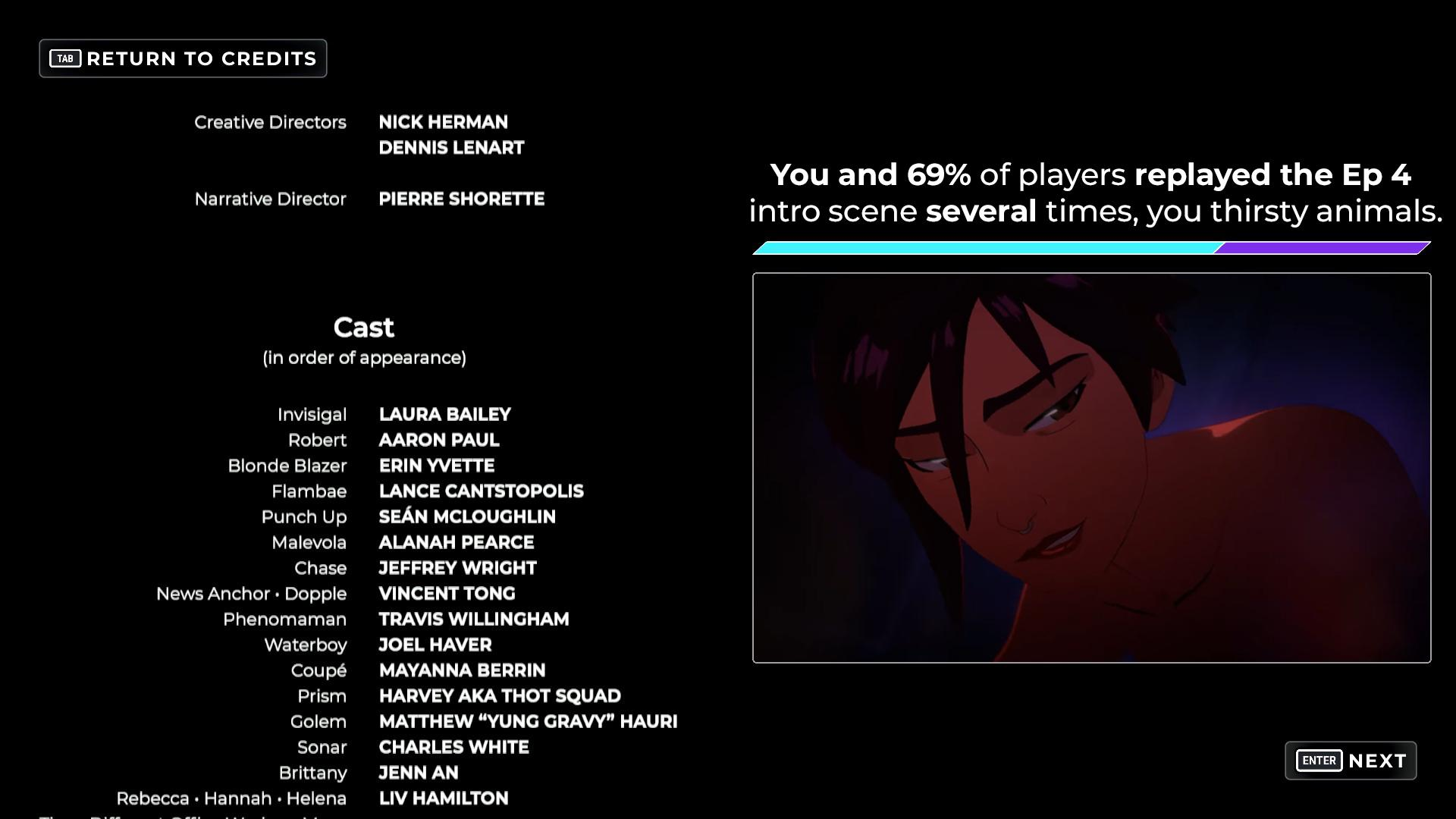 The Dispatch cast is an eclectic mix of celebrities, voice actors, and online personalities. Aaron Paul, aka Breaking Bad's Jesse and FFXV Nyx, voices the main character. Laura Bailey is Invisabitch/gal. Charlie is Sonar, Jack is Punch-up, Yung Gravy is Golem, and some other soundcloud rapper is Prism. Critical Role's lineup voices a good chunk of the side characters and Joel Haver is Waterboy. Of course, Laura and Aaron fucking kill it. Aaron Paul could totally VA for Batman. Charlie's one of the better online personality voice actors. Golem is basically a non-character with useful abilities. It's just Yung Gravy's voice down-shifted and saying some hip hop lines like "another one" and "stay winning" Charlie's basically playing himself so his performance is better than I expected it to be and leagues above Alanah. He's not monotone like his talk videos. Joel Haver's performance was actually weaker than it is in his videos. I'll chalk it up to voice direction. Harvey/Thot Squad is Prism and I think her and Charlie's performances are simply because they're speaking as themselves and not trying to ham it up, making their lines seem more natural.