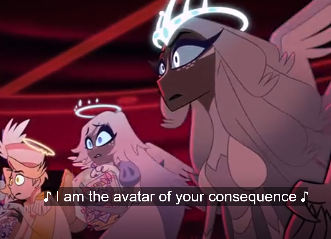 Like she still says Redemption is great and Charlie should keep trying to redeem the souls who want it, but for the ones who reject it and dare raise their hands against the people of Heaven must be smote with all of Heavens might.