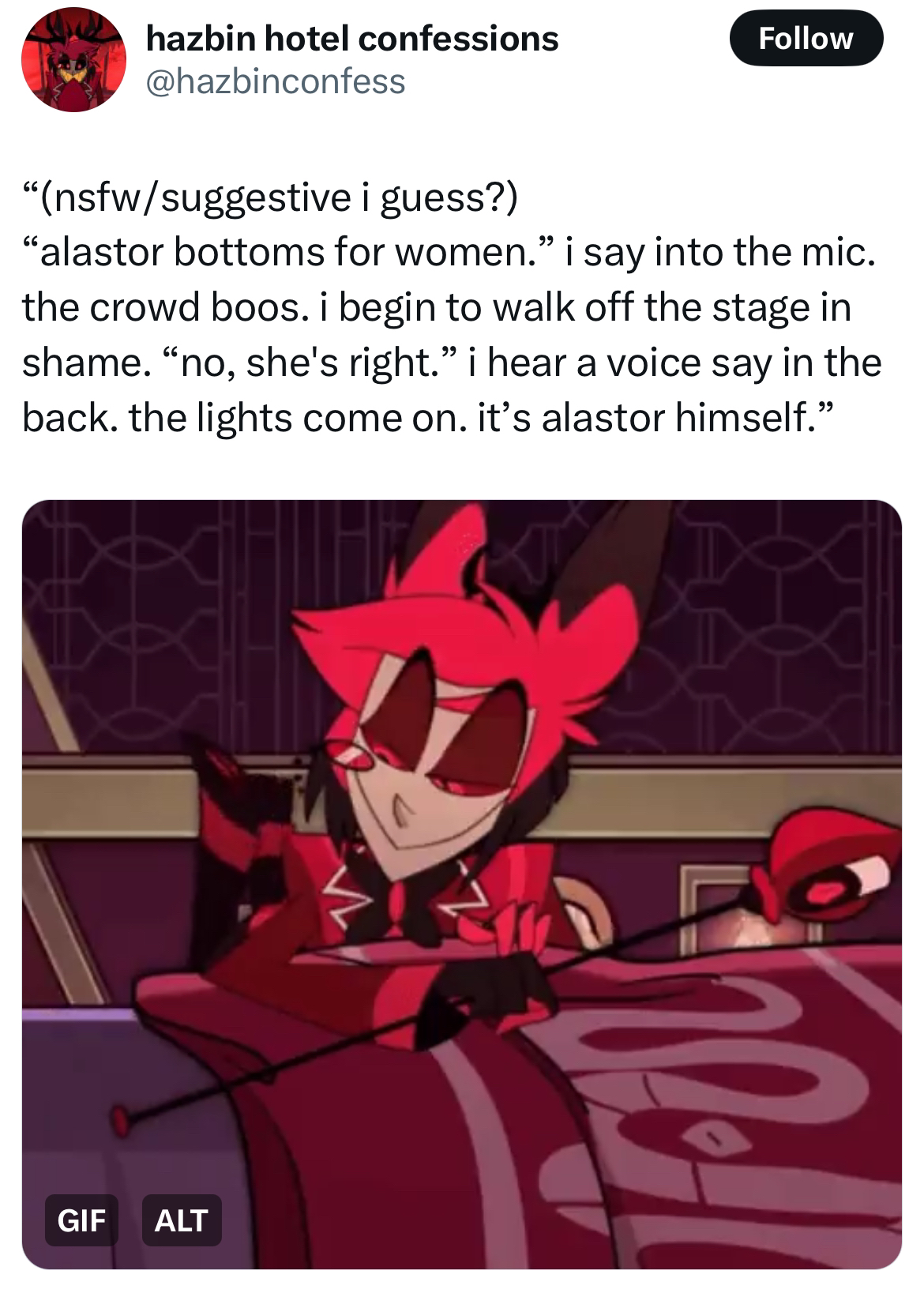 But I think him being a switch/verse makes sense considering Vox likes to be all high and mighty and in charge but Alastor has so much hold on him you can tell he can easily put him down in his place and the way he gets worried and meek when Val gets angry at him screams sub.