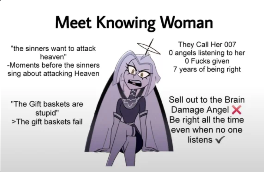 And antics like Lucifer being unable to fight sinners is simply bad writing EVEN for Viv. The big deal with Lucifer in religious scripture is he can fuck with living people (story of Job or when he tried to offer Jesus his own kingdom) and if you end up in Hell Lucifer can torment your soul because Hell is his territory. Honestly Hazbin Hotel's writing is objectively quite awful. And don't say "We can't have Lucifer beating Charlie's enemies for her!" Just fuck this horrible writing and fuck anyone who tries to defend it.