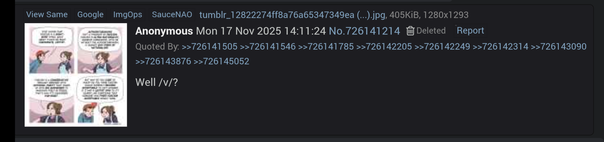 >>151334393>>151334416South park "comfy threads" are made for the people that ship the characters. Every other thread is made by the same /pol/tard to mald and spam about leftists. Then a separate lefty /pol/tard will show up to counter spam.For all the newfags, there are two "well /co/?" posters. The original well /co/ poster only posts assigned male comics and will often be found spamming on boards like /v/ too. He has been doing this for a decade of his life. There's a second "well /co/" poster that will post the Charlie Kirk tweet about not releasing the Epstein files to protect Republicans as counter bait, and he only started posting recently.