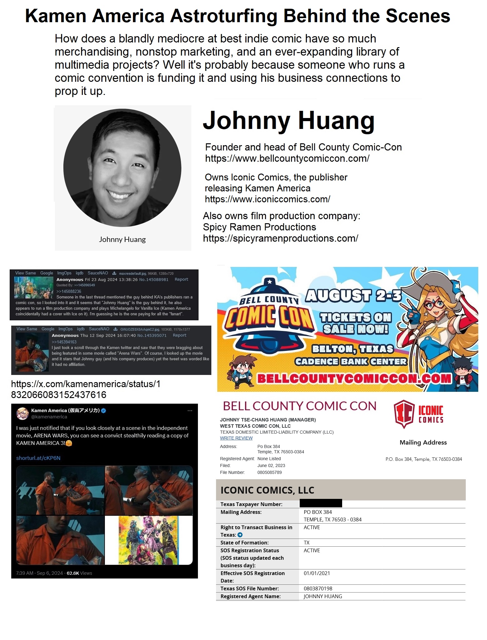The real story here is how a shitty comic has so much marketing, merchandise, and spinoff projects. People mentioned that this Johnny Huang guy owns the publisher and a comic convention before so I looked at some public records and confirmed it. He's the head of the Bell County Comic Con and also owns Iconic Comics which publishes Kamen America. They're all listed under the same business address. It also looks like this guy has a lot of other companies. All the weird cases suddenly make a lot more sense when you realize the guy funding the comic is also using his comic convention connections and authority to push this shit.