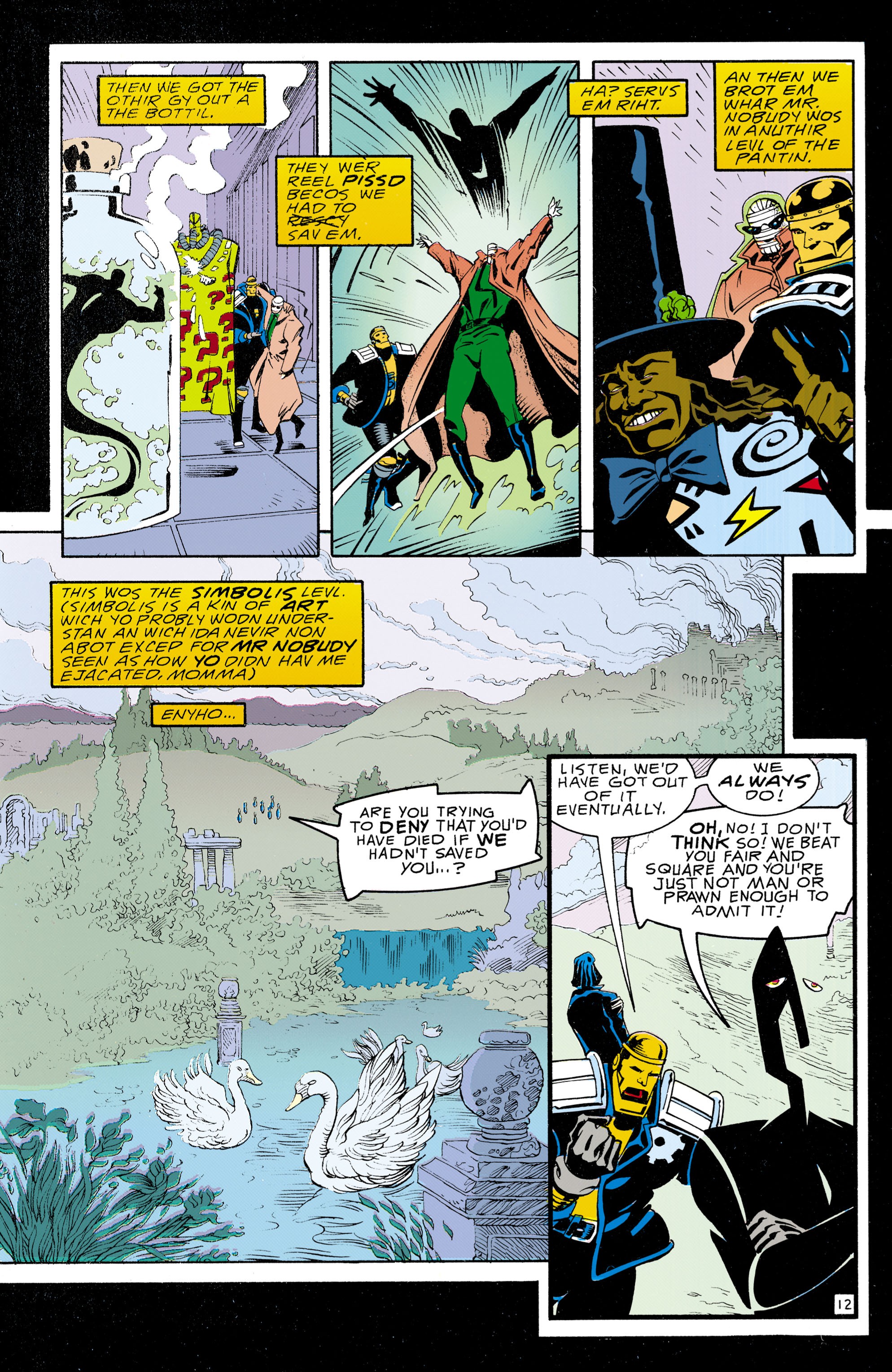 >>151367698We never got any explanation for how Mr. Nobody became Mr. Somebody and why he switched from absurdist dadaism to capitalism. The run was canceled before we could learn what his actual goal was. Some aspects of the run were carried over into the next like his desire to control the narrative (switching from manipulating the media to feeding people reality breaking supplements), but he was reverted back to Mr. Nobody by then.If storytiming wasn't such a bitch to do these days, I'd post issues 27, 28, 29, 49, 50, 51, and 52 from the 1987 run to finish up his second and third outings.Then parts of issues 11, 12, 14, 20, and 22 from the 2009 run for his stint as Mr. Somebody.Then I'd have to figure out which issues from the 2016 run he was referenced by, made mention of, or appeared therein to finish up the complete character study.