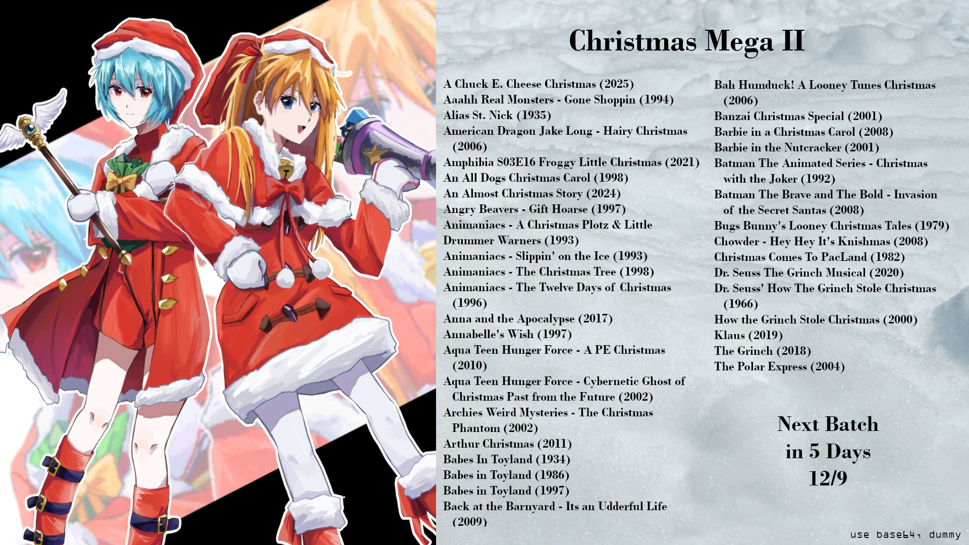 >>151632691DAY 9Rick & Morty: Ricktional Mortpoon's Rickmas Mortcation, Rick and Morty Special A Very Merry Rickmas Yule LogSmiling Friends: Charlie Dies and Doesn't Come Back, The Glep EpThe Sylvester & Tweety Mysteries: It Happened One Night Before Christmas, Feather ChristmasBatman the Animated Series: Christmas with the JokerThe New Batman Adventures: Holiday Knights Static Shock: Frozen OutFreakazoid!: In Arms WayJackie Chan Adventures: A Jolly J-Team Xmas¡Mucha Lucha!: The Match Before XmasJohnny Test: A Holly Johnny Christmas/Johnny's First Annual Snowball, Johnny's Holiday Light FightBatman: The Brave and the Bold: Invasion of the Secret Santas!Taz-Mania: No Time for ChristmasBaby Looney Tunes: Christmas in JulyWhat's New, Scooby-Doo?: A Scooby-Doo ChristmasTom and Jerry Tales: Ho Ho HorrorsThe Looney Tunes Show: A Christmas CarolLooney Tunes Cartoons: Bugs Bunny's 24-Carrot Holiday SpecialBah, Humduck! A Looney Tunes ChristmasGrandma Got Run Over by a Reindeer Pinky and the Brain: A Pinky and the Brain ChristmasPinky, Elmyra & the Brain: Yule be SorryAnimaniacs: Slippin' on the Ice/''Twas the Day Before Christmas/Jingle Boo/The Great Wakkorotti: The Holiday Concert/Toy Shop Terror/Yakko's Universe, A Christmas Plotz/Little Drummer Warners, The 12 Days of Christmas Song, Noel, The Christmas TreeAnimaniacs Reboot: How the Brain Thieved Christmas: Part 1/Santamaniacs/How the Brain Thieved Christmas: Part 2Tiny Toon Adventures: It’s a Wonderful Tiny Toon Christmas SpecialThe Spectacular Spider-Man: ReinforcementX-Men Evolution: On Angel’s Wings