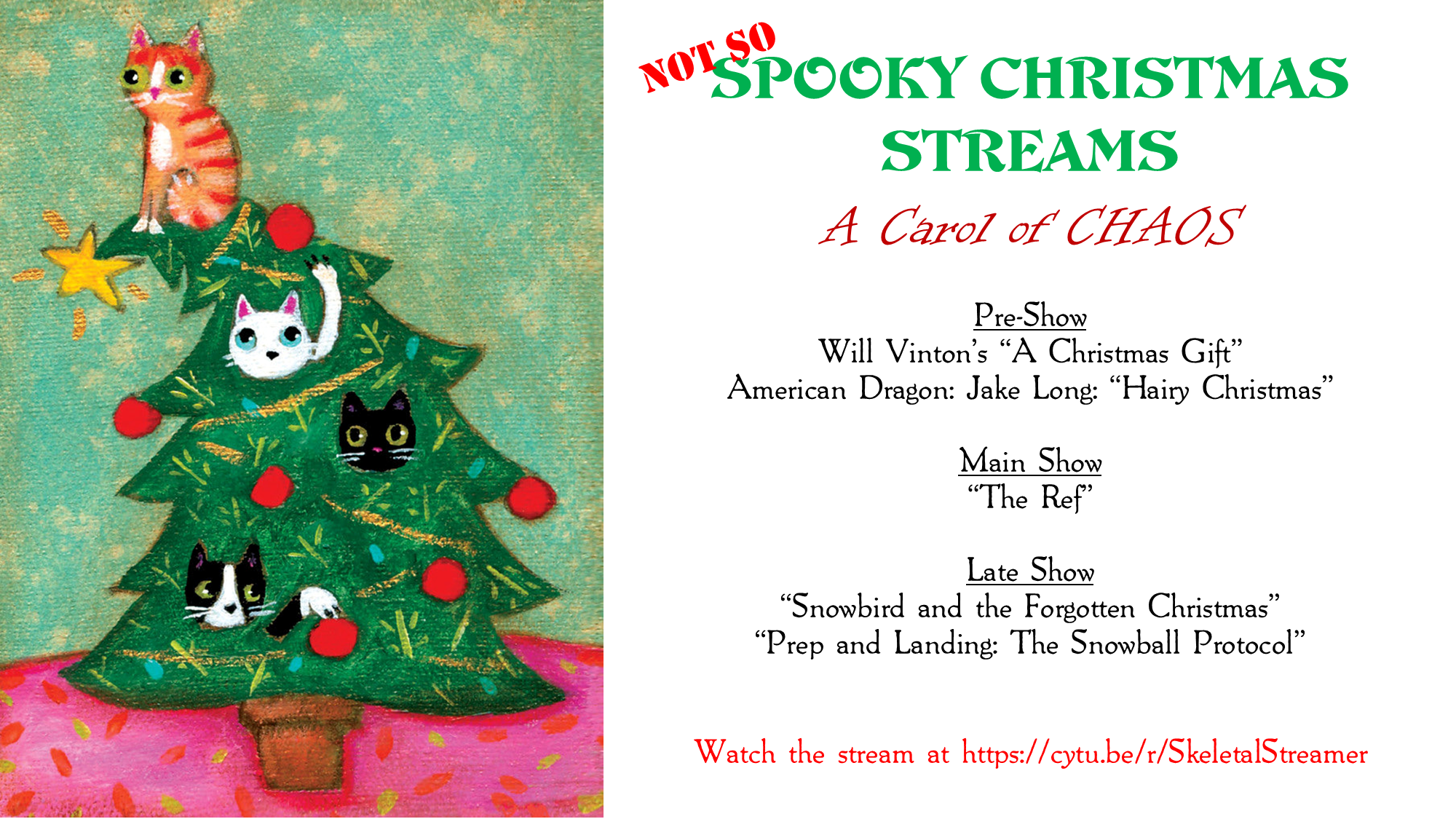 TONIGHT ON A NOT SO SPOOKY CHRISTMAS STREAMAfter such a lengthy stream last night, it’s time to wind down with something easier, but no less joyful and amusing. First, from the Claymation works of Will Vinton, a simple, but beautiful Christmas shared between a boy and an elderly woman. Then, Jake Long, desperate to avoid his family’s “lame” traditions, spends the holidays trying to rescue a baby sasquatch.Our sole movie tonight involves a botched heist on Christmas Eve, in which a master thief is forced to take two hostages in order to make his getaway. Of course, he had to pick the two biggest pains in the ass in town, a bickering couple who are soon to be joined by their even more horrid relatives. If this crook has any chance of getting a clean escape, he has no choice but to take up the role of THE REF.In the late show, we start with a forgotten Christmas special that is, quite ironically, about a Christmas that a group of puppet pals are slowly being forced to forget. Then, we conclude with the newest installment of Prep and Landing, in which Lanny and Wayne what may be their biggest blunders yet.Stream Link: cy(delete this part)tu(DOT)be(slash)r(slash)SkeletalStreamer