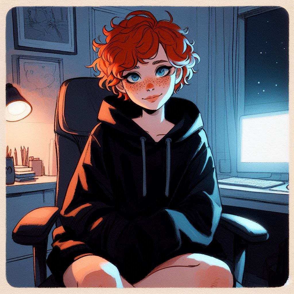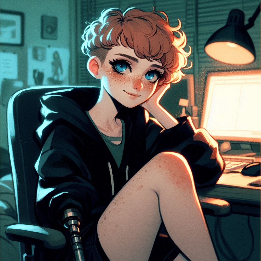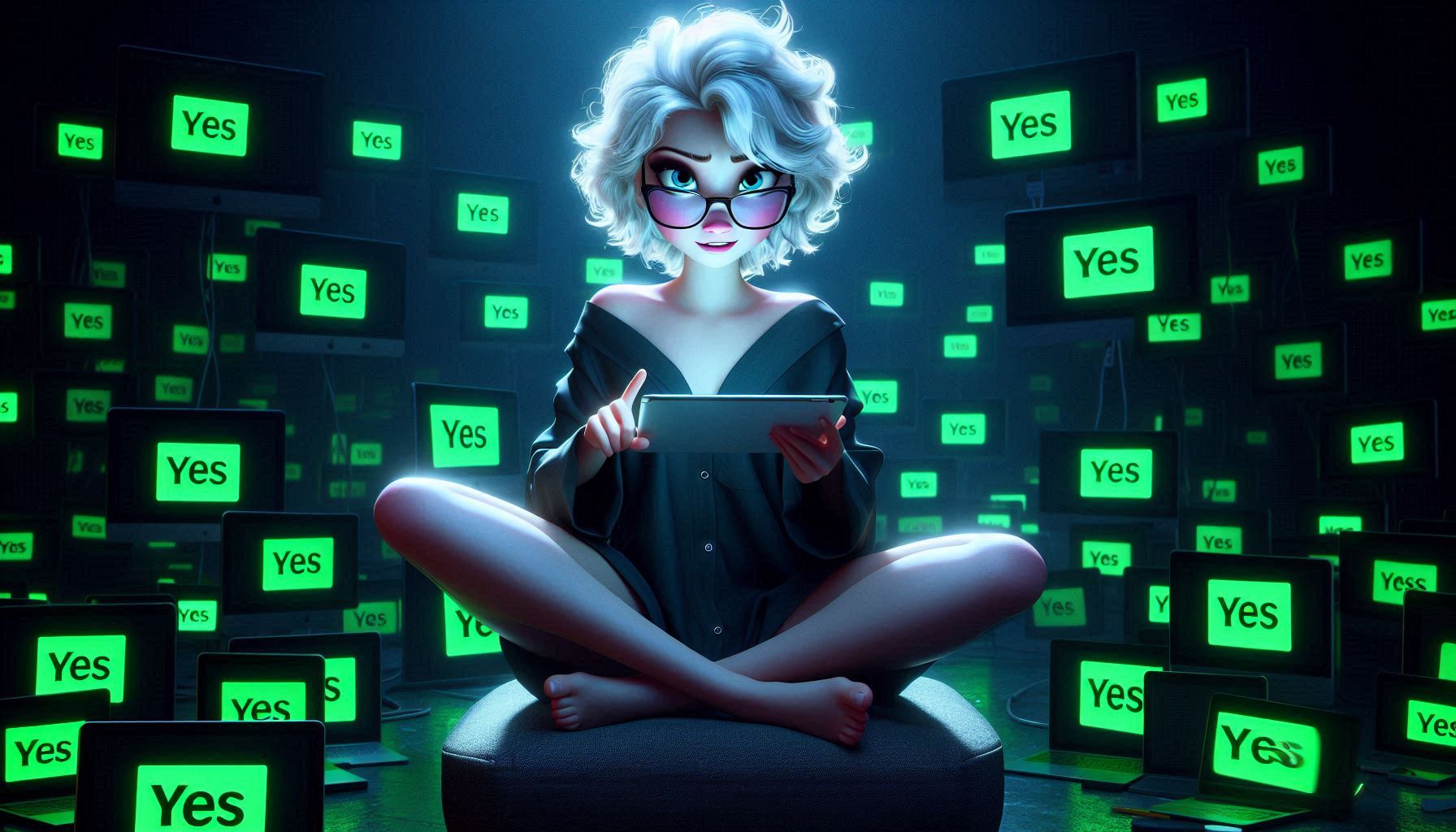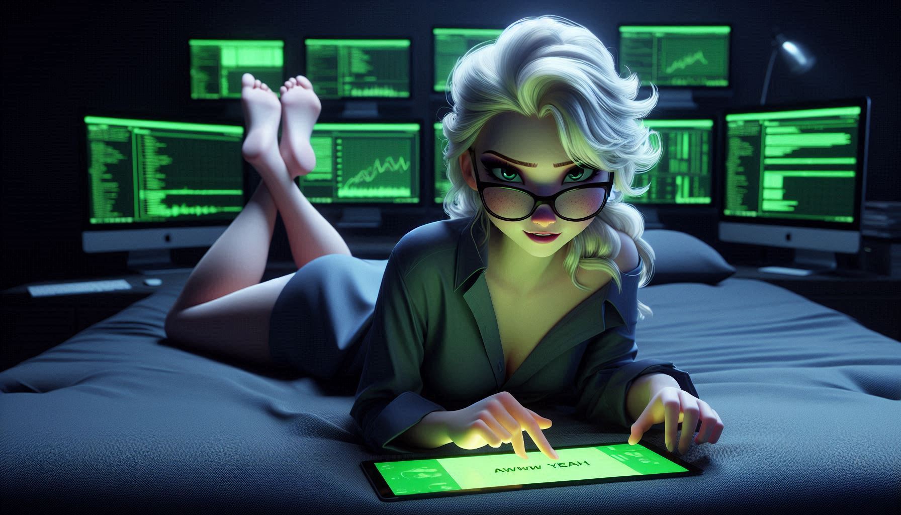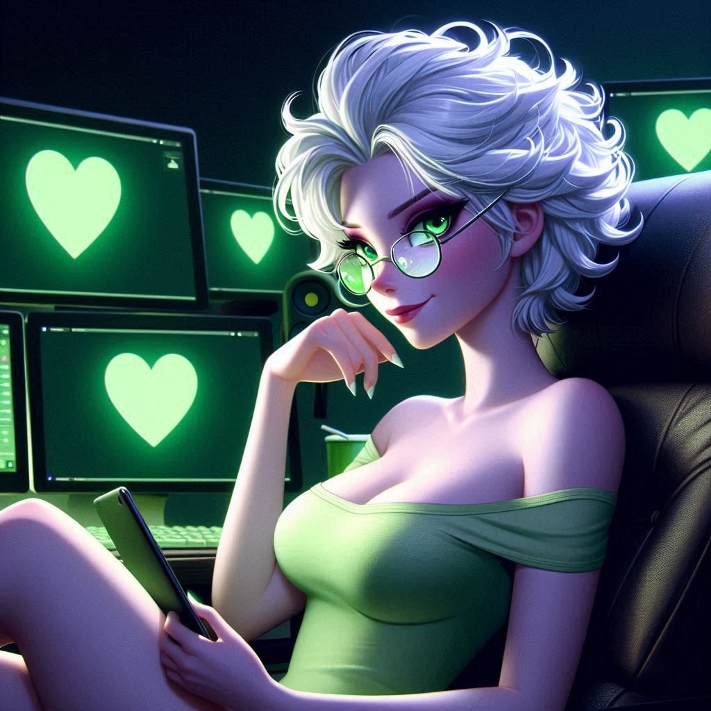 >>151601952impressionism sketchy version of disney cg art, elsa with messy curly white short-hair, glasses, wearing a short plain lime tanktop and matching bottoms, sitting in an onyx chair, bare shoulders, looking intense with a sly smirk, coy, holding a tablet with lime heart icon, a streaming station desktop with several dark computer monitors randomly on the wall with lime green heart icons on the monitors, in a dark room at nightI fiddle with the prompts, so wording is not exact, something like this. feel free to fiddle with it yourself and share results!