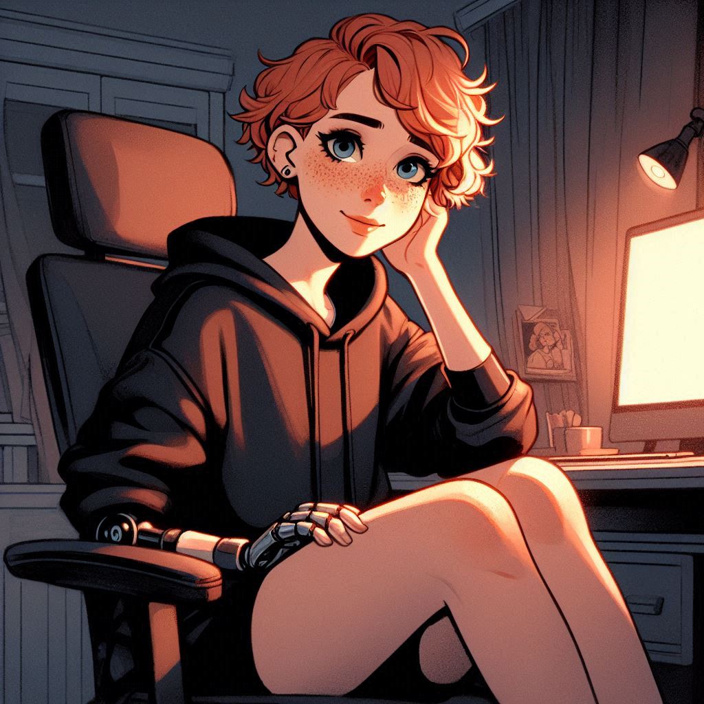 The style I’m using really likes making Aubrey super cute for some reason. Also likes to not include her prosthetic arm, too.