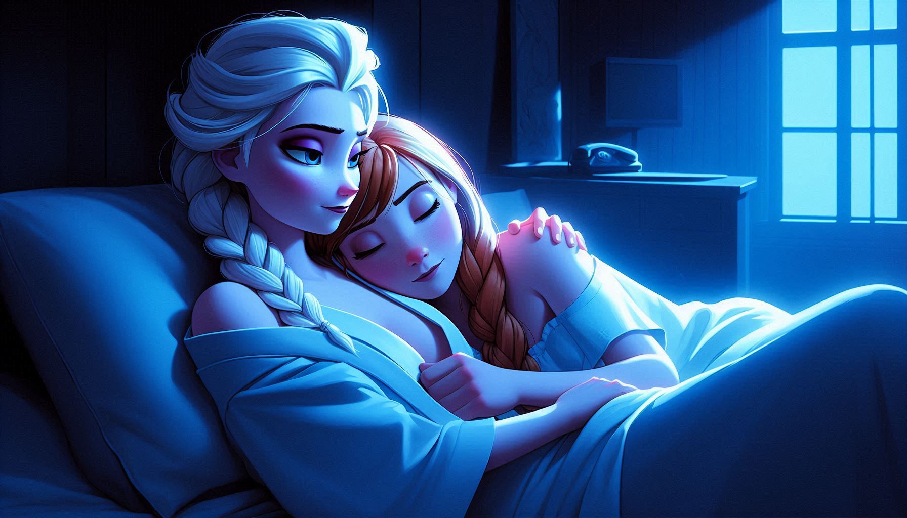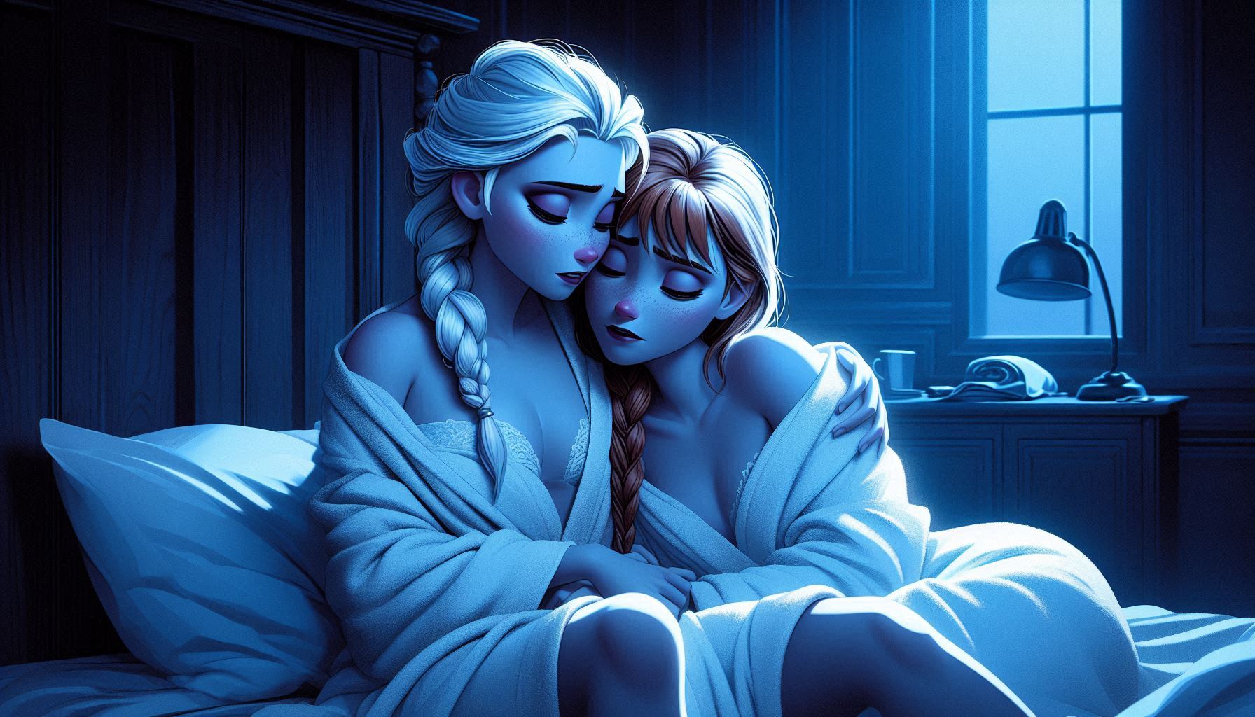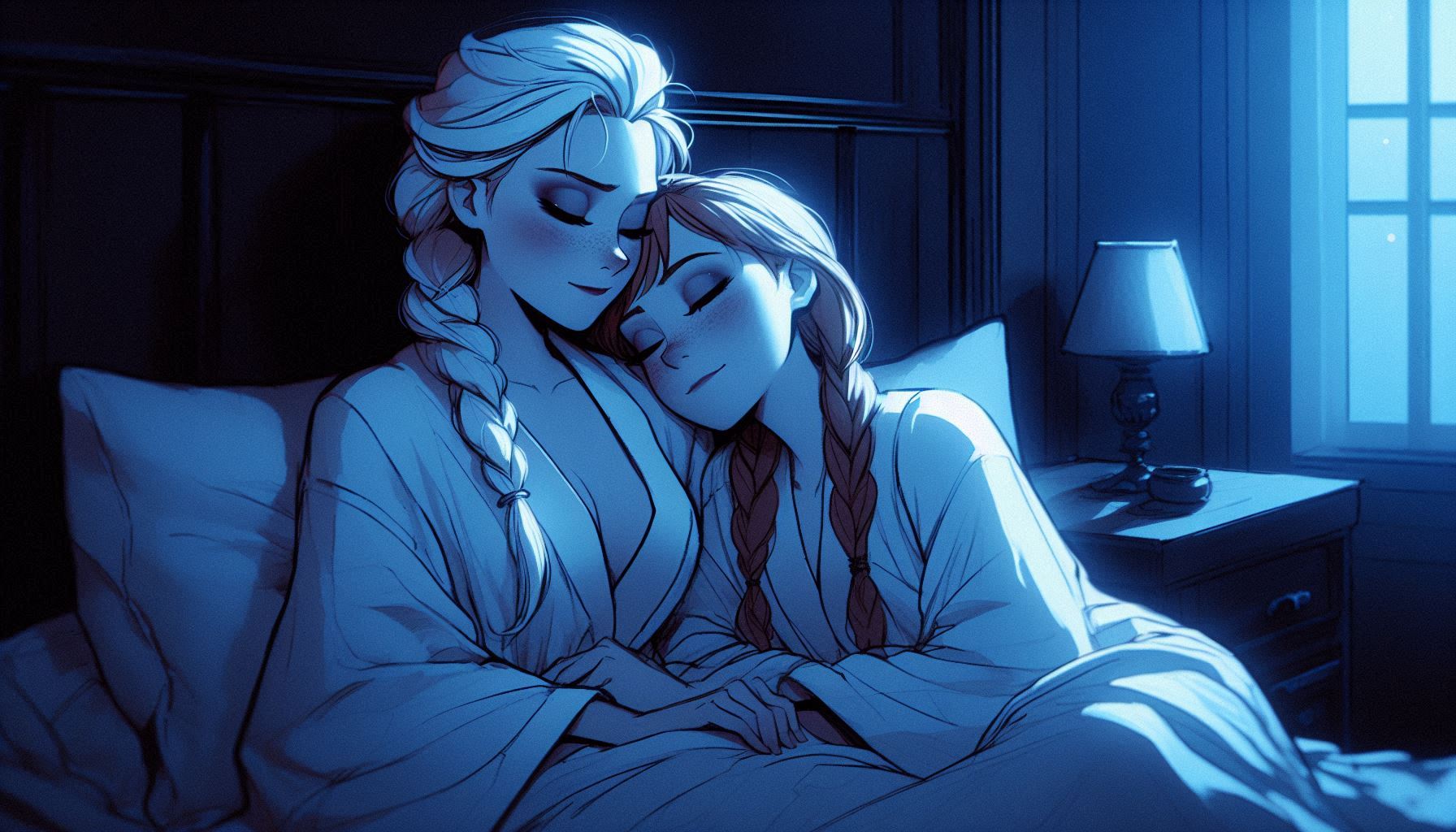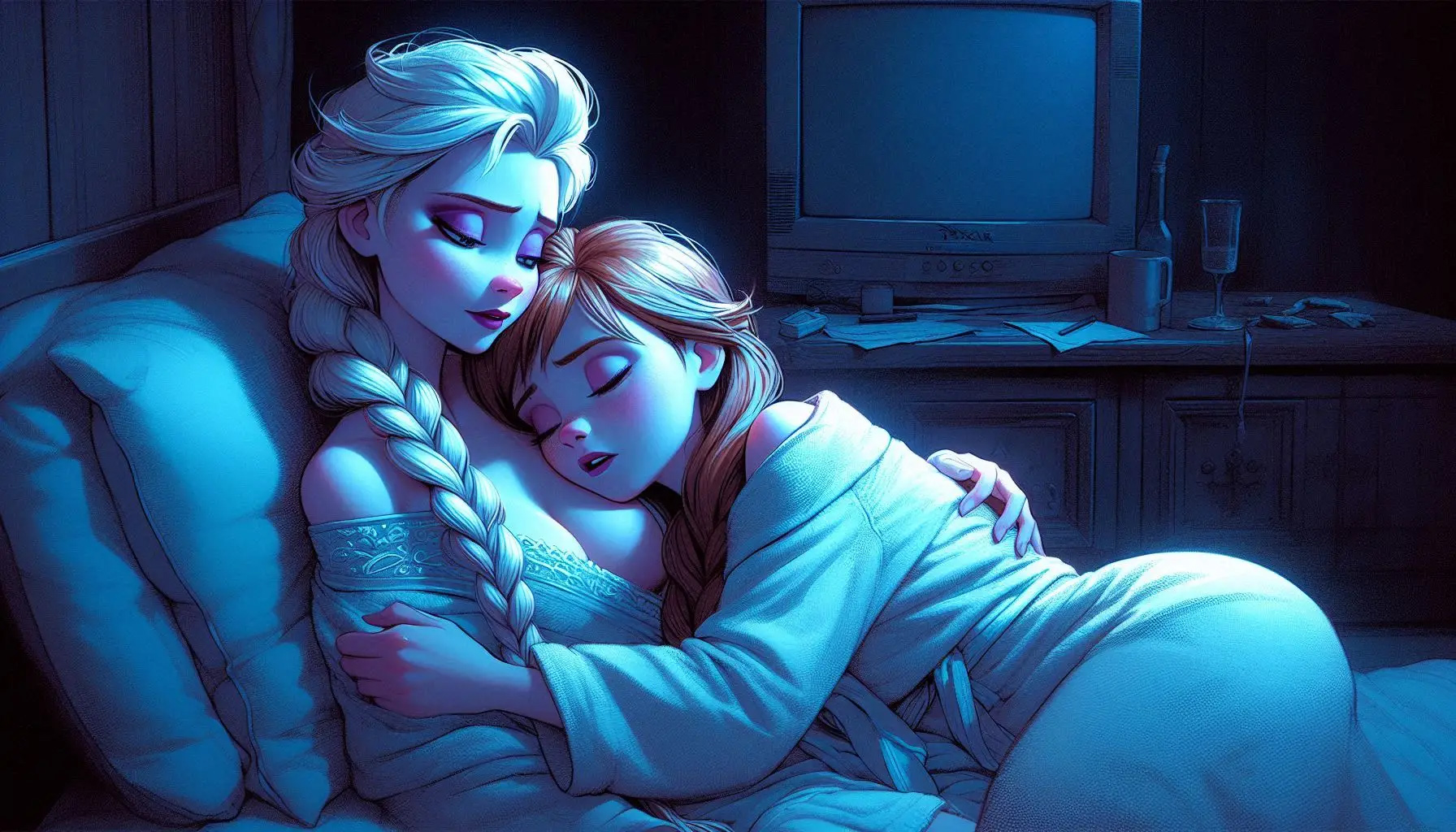 Nice pair indeed. try it out yourself if you like:pixar art, dark blue lighting, 2 women,Elsa and anna(braided pigtails, lover, feminine) from frozen, half-closed eyes, extremely romantic scene,wearing white bathrobes(bosom), nightgown, elsa arm around anna, expressionless sad,moody bed scene, tv offscreen,night, bedroom, lying in a bed, towel onl,tired, barefoot,cuddling elsas has arm around anna, annas head on elsa, shoulders bare, anna hug elsa, kissing,dark room,moody lighting,detailed manga painting art,masterpiece