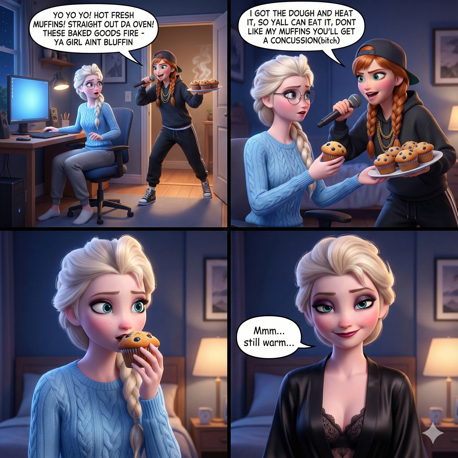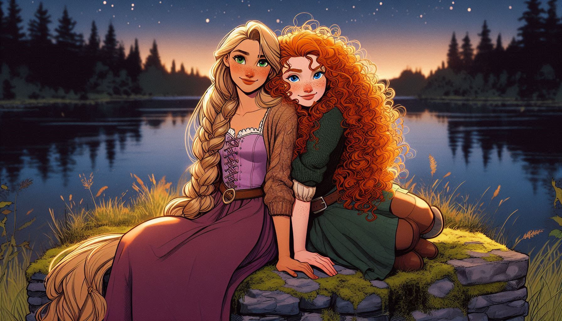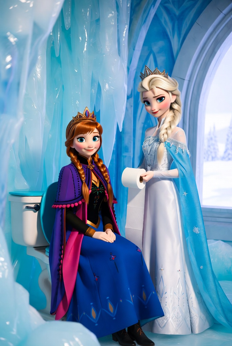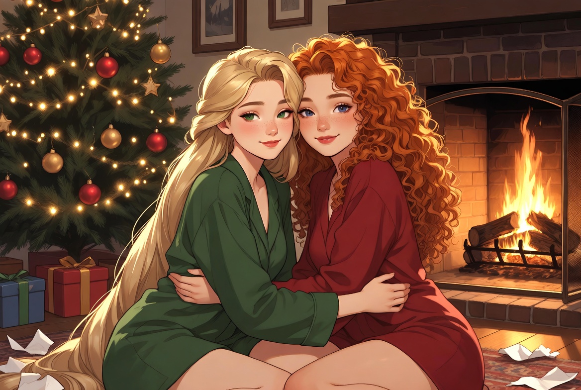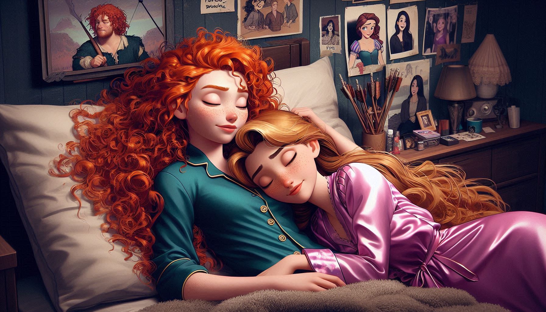 Nice pair indeed. try it out yourself if you like:pixar art, dark blue lighting, 2 women,Elsa and anna(braided pigtails, lover, feminine) from frozen, half-closed eyes, extremely romantic scene,wearing white bathrobes(bosom), nightgown, elsa arm around anna, expressionless sad,moody bed scene, tv offscreen,night, bedroom, lying in a bed, towel onl,tired, barefoot,cuddling elsas has arm around anna, annas head on elsa, shoulders bare, anna hug elsa, kissing,dark room,moody lighting,detailed manga painting art,masterpiece