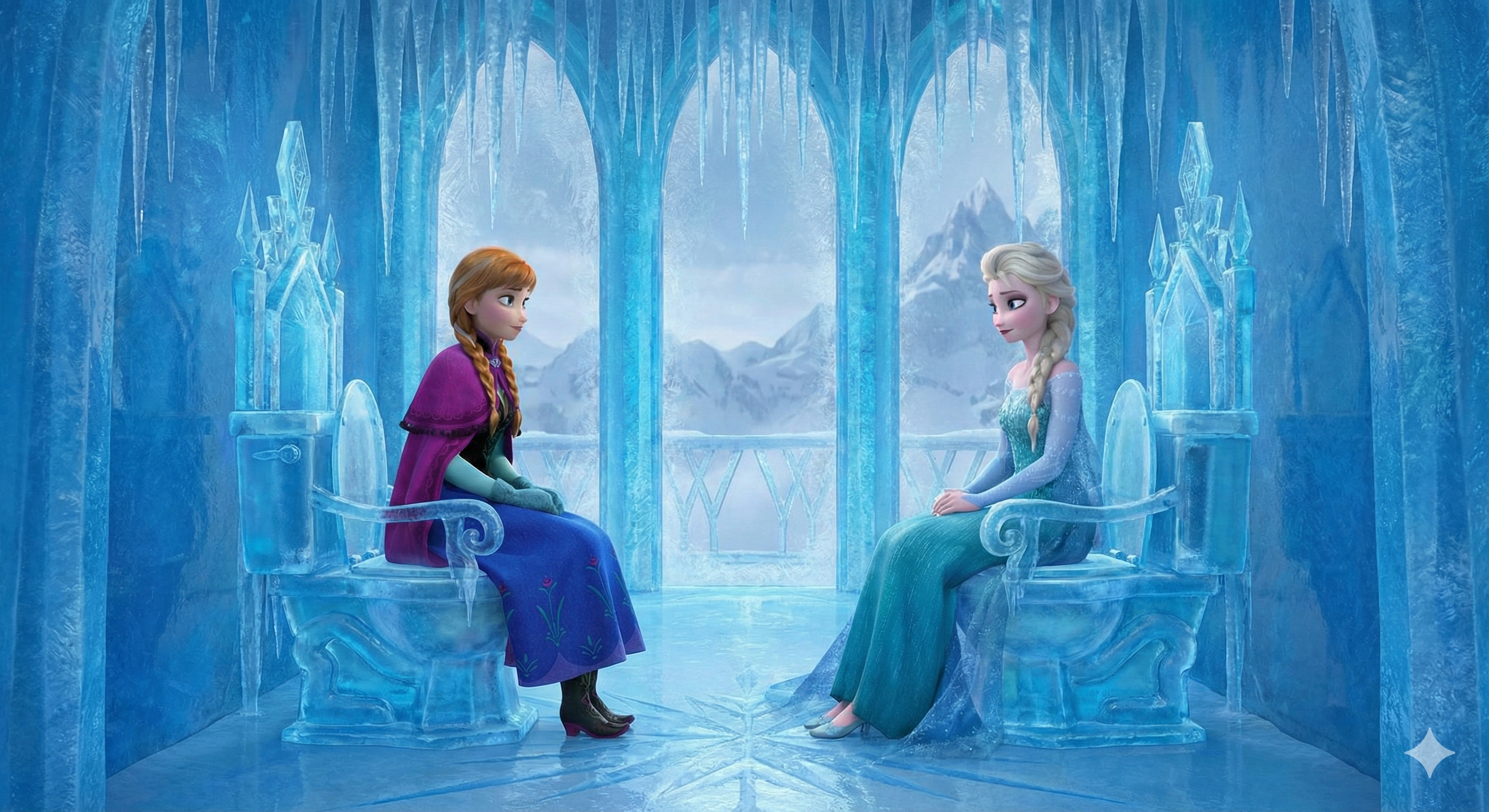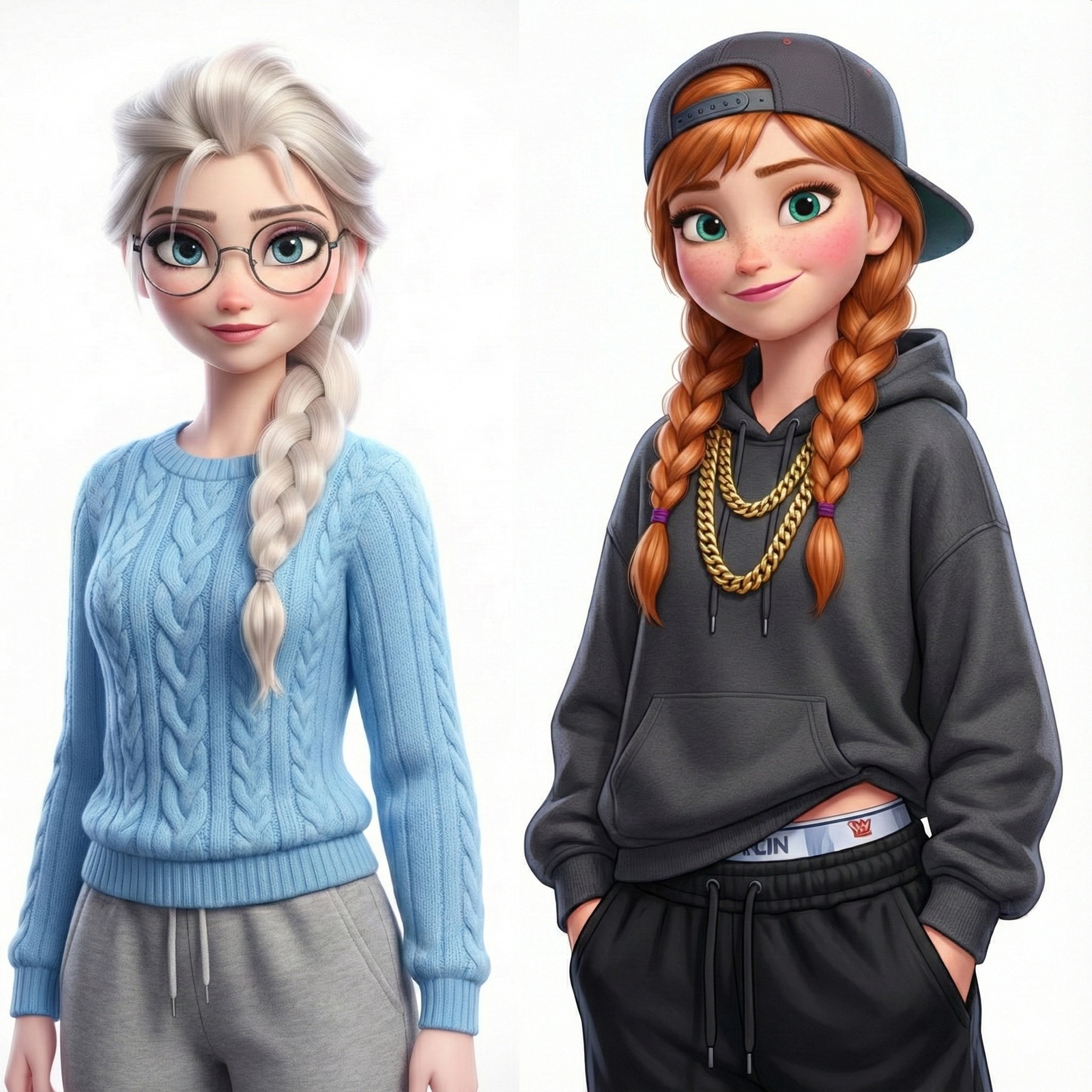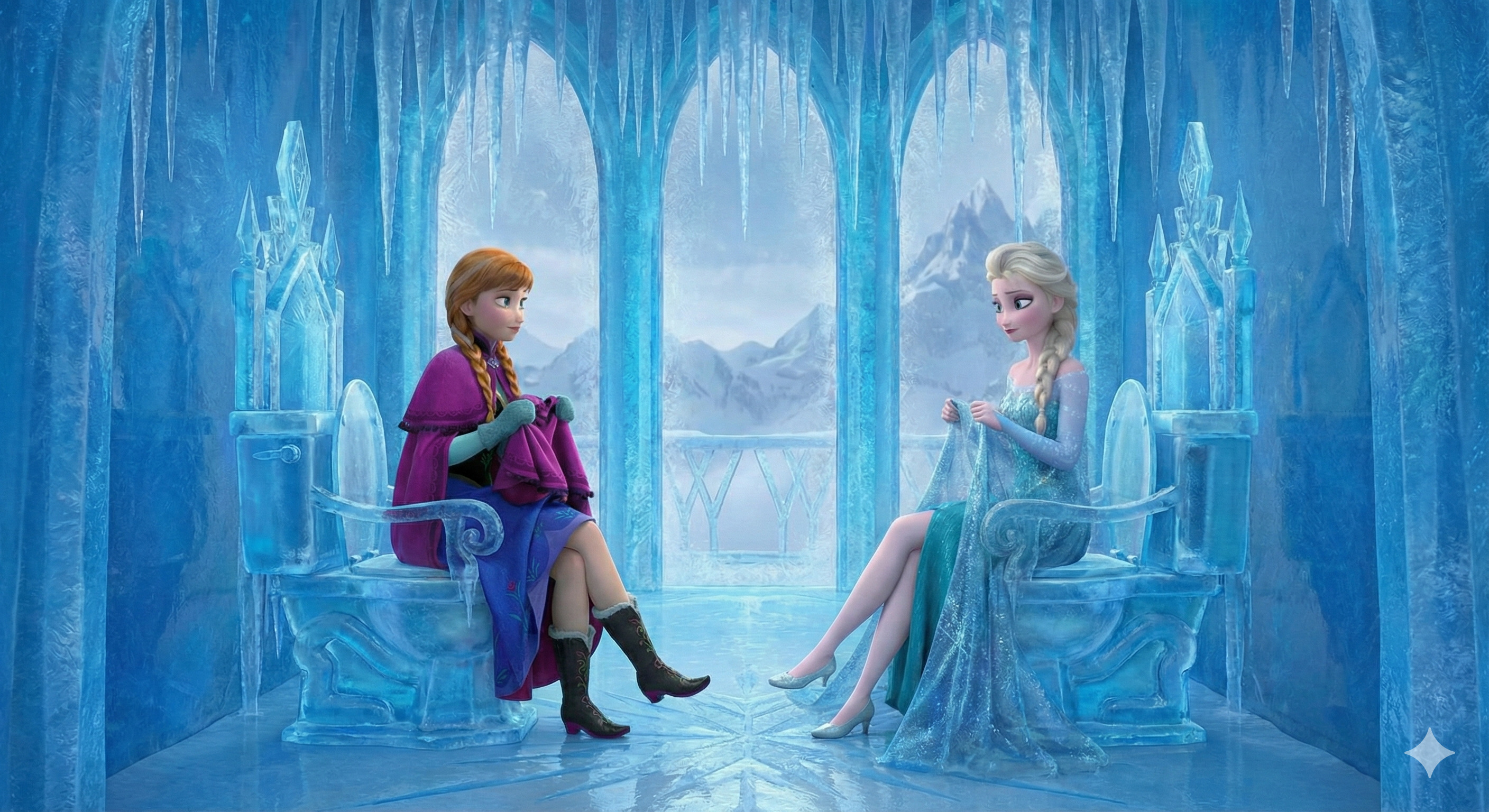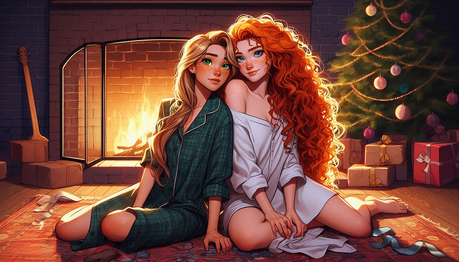 Nice pair indeed. try it out yourself if you like:pixar art, dark blue lighting, 2 women,Elsa and anna(braided pigtails, lover, feminine) from frozen, half-closed eyes, extremely romantic scene,wearing white bathrobes(bosom), nightgown, elsa arm around anna, expressionless sad,moody bed scene, tv offscreen,night, bedroom, lying in a bed, towel onl,tired, barefoot,cuddling elsas has arm around anna, annas head on elsa, shoulders bare, anna hug elsa, kissing,dark room,moody lighting,detailed manga painting art,masterpiece