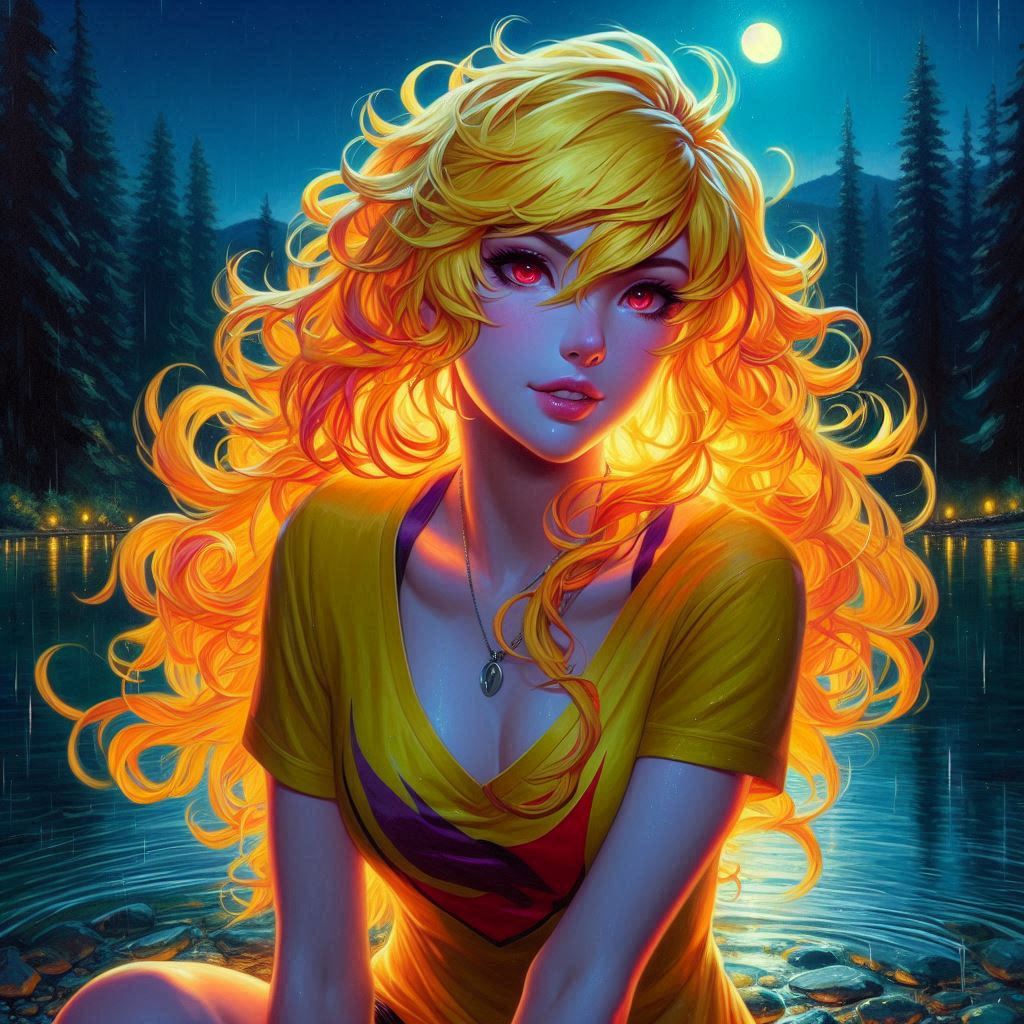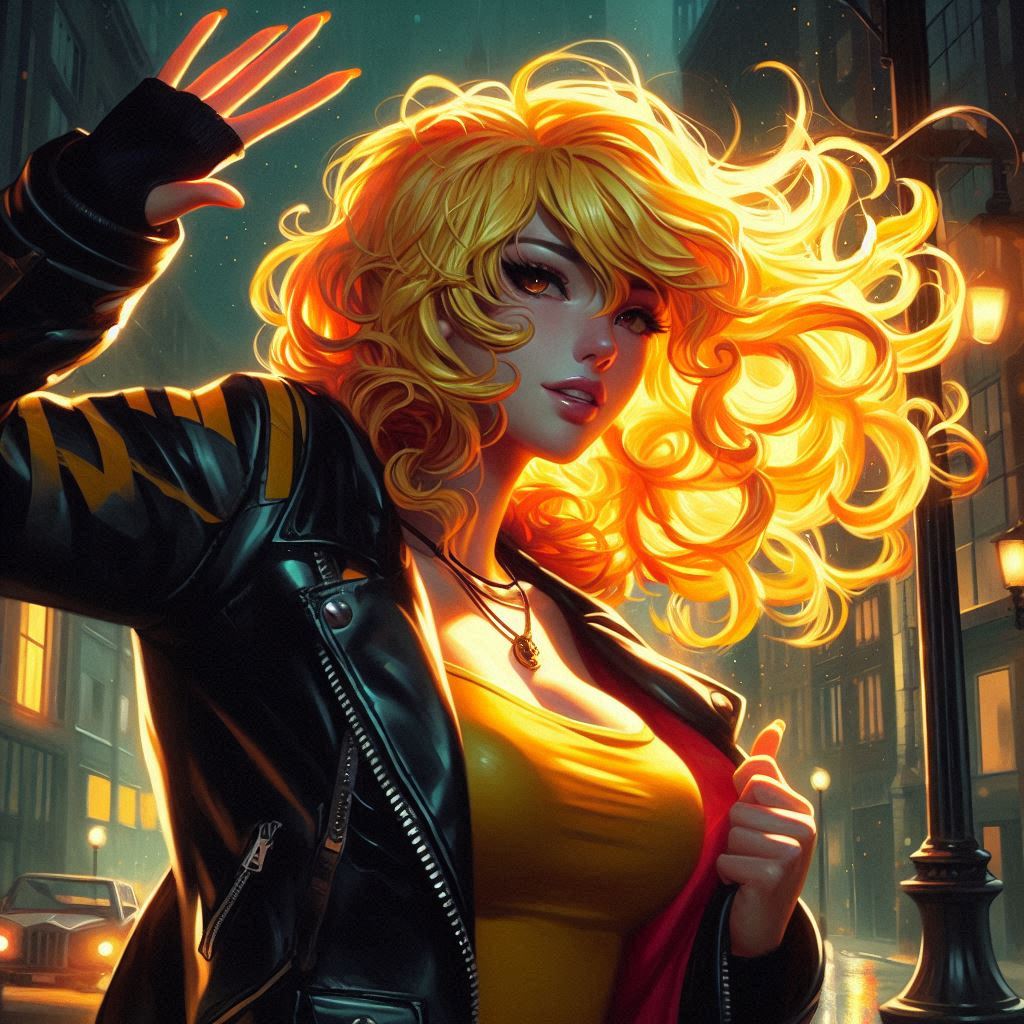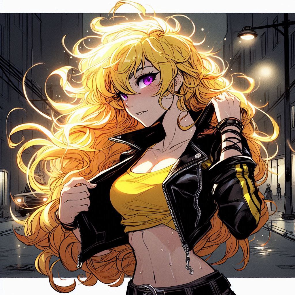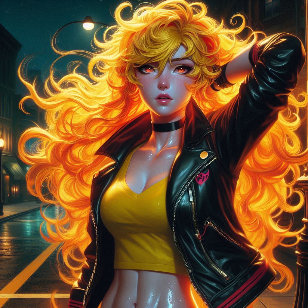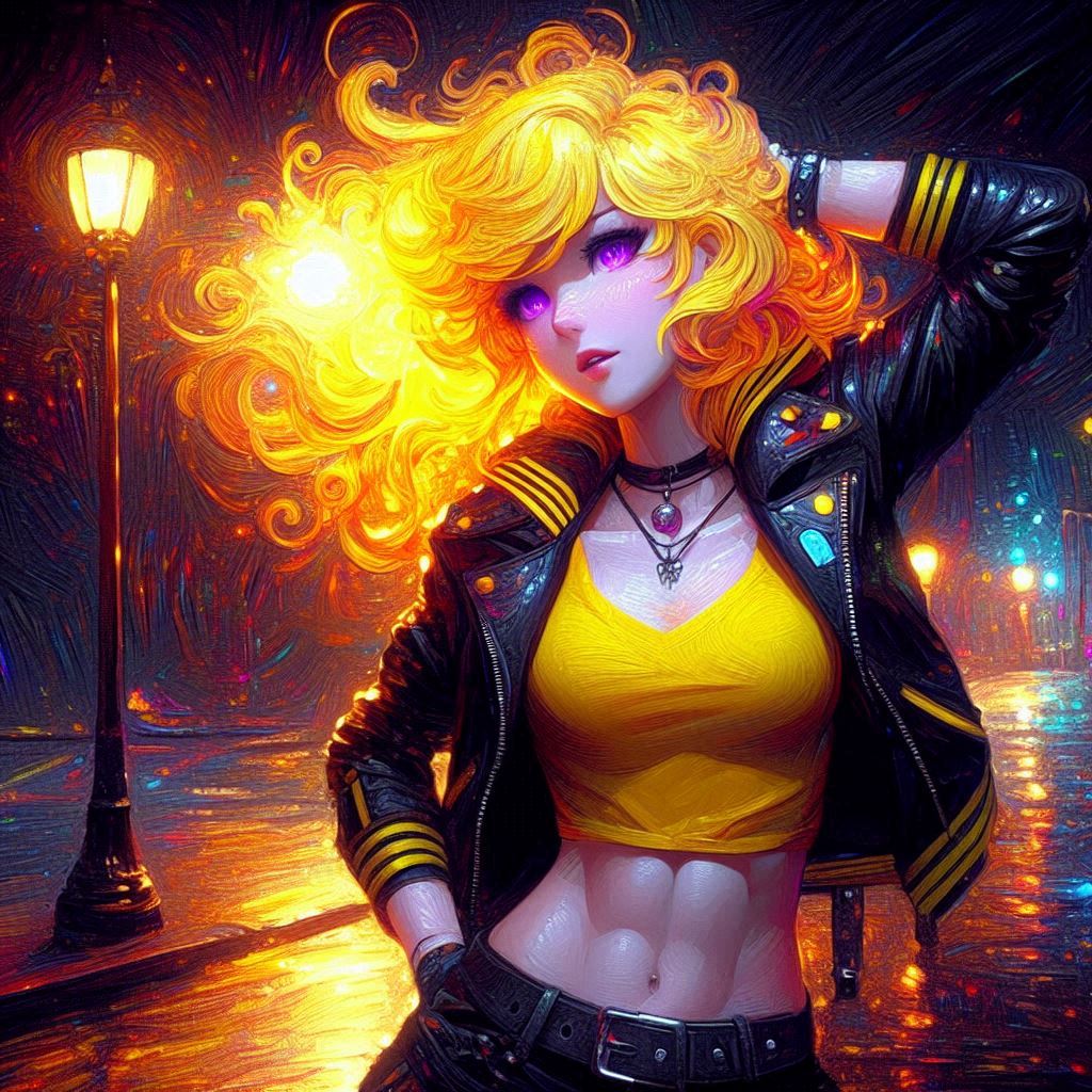 >>151601952>high quality highly detailed oil painting photograph of:: Yang from RWBY (wavy Blonde hair, red eyes) wearing black biker jacket with yellow stripes over yellow tshirt, Hair is fiery and luminous against the dark sky, décolletage, looking at viewer, embracing self singing, perspiring, exhausted. under dull street lamp, dark city street. wave at viewer. Feminine, abs, vneck, barearms, 1990s Americana, RWBYSometimes the abs actually appear.