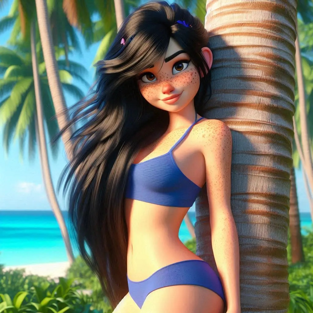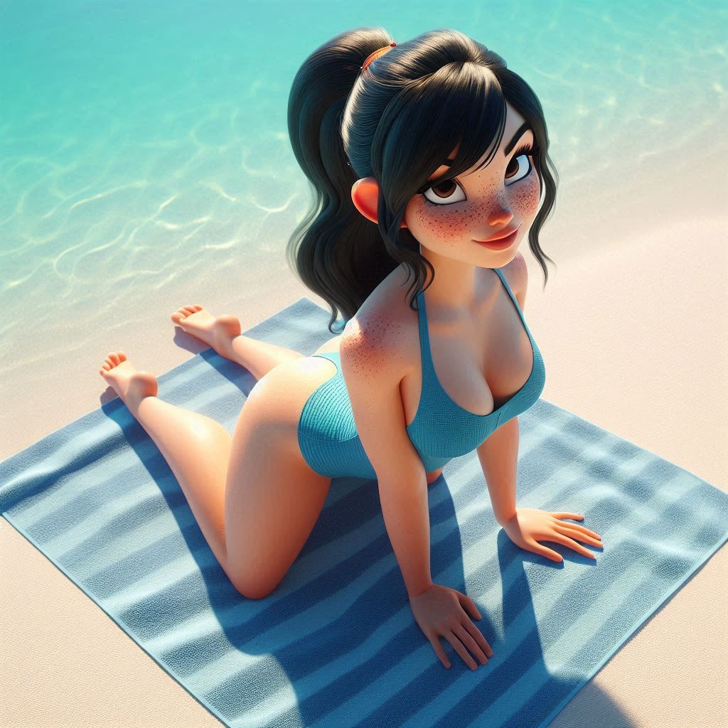>>151640906>Disney-style 3D render, young adult Vanellope von Schweetz, freckles, black hair, curvy athletic body, wearing a blue swim top and blue swim trunks, long messy hair parted to left, stretched out on a striped beach towel, drone view from directly overhead with palm tree shadows crossing the sand around her.