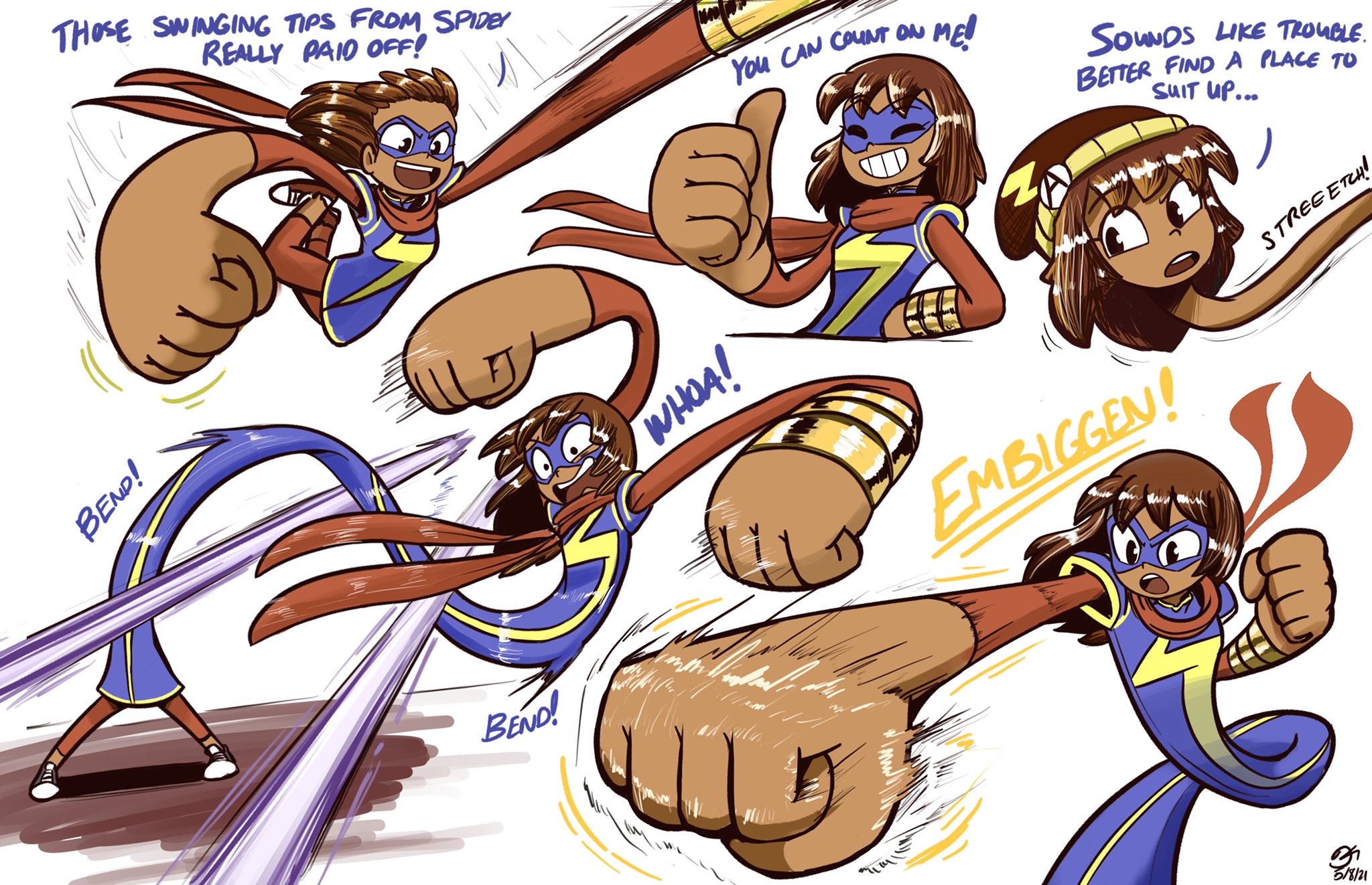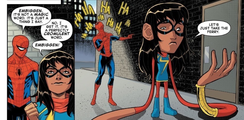 >>151649702One of Kamala’s problems is that Marvel is afraid to make her look “too” goofy. Like picrel only gets to happen because her and Miles swap bodies.