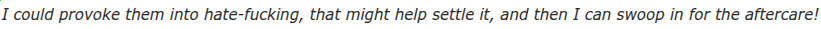 >>151657410I could make him having a quivering screaming orgasm to remind her of her femininity.