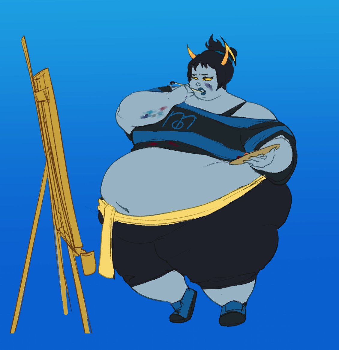 >>151682091Remele painting a blue painting while having a snack out of some grub