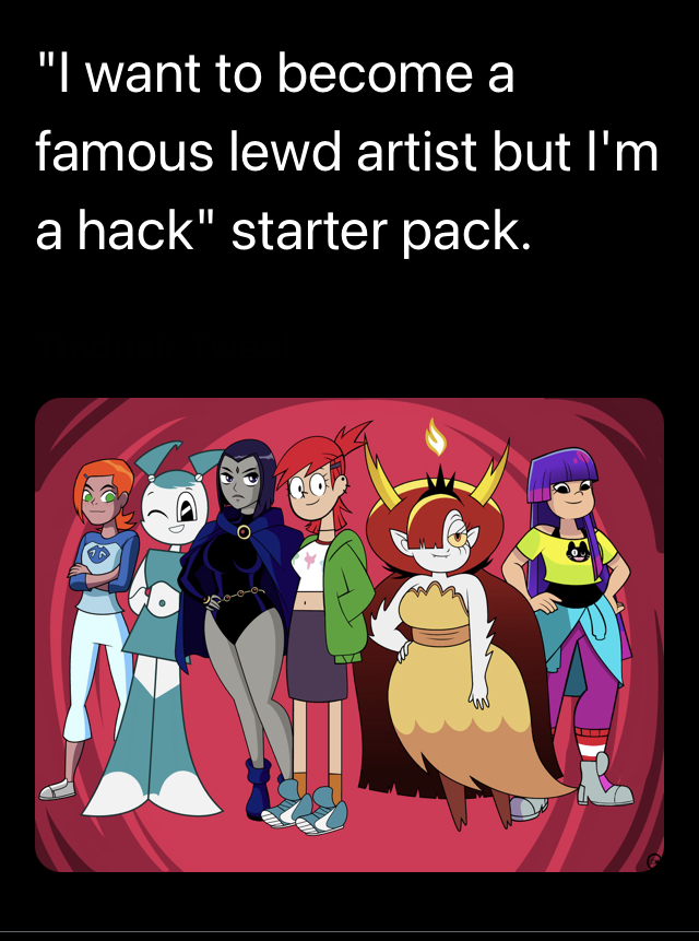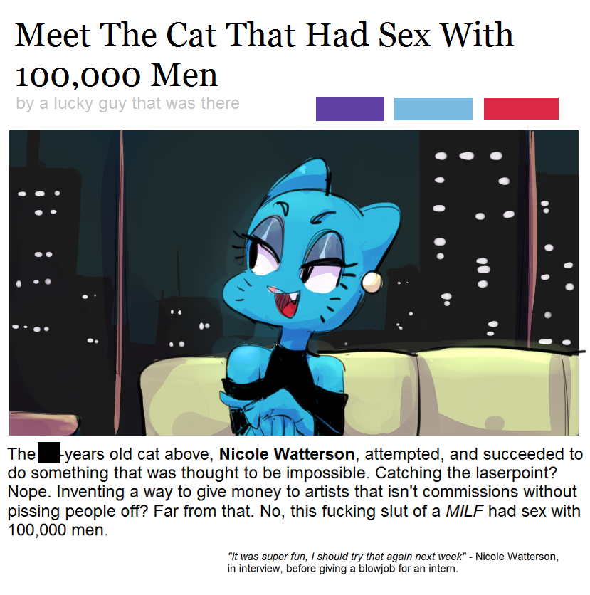 >>1516976901) "Being your own boss" is easier said and harder to pull off on a daily basis, as there are numerous stories of artists struggling even with Patreon/SubStar2) Degenerate's cope, being able to look at porn all day while having to make ends meet making porn is not "living the dream"3) "Paid handsomely" by perverts who may be all to eager to cross boundaries if they feel like it; even if they're your personal friends, then they're going to use you however they will.4) "Niche audience money" only lasts so long as you can crank out enough porn for them, but no one is a perpetual motion machine5) A matter of personal preference and therefore subjective, as it's not a matter of talent but adeptness like any skill6) Internet numbers which rarely, if ever, translate into earnings. Besides, several industryfags are pornographers, such as Yves Bigerel/Balak/Hecchidechu, Derrick Malik Johnson/Bronxden, and I'm sure many more that I'm not entirely aware of or who have an alter ego for making porn.Anyway, here's some more degenerate's cope:https://desuarchive.org/co/thread/150930404/#150932244>"Find a well made faithful and on model Paranorman animation with Courtney's ass looking spectacular">"She starts brapping continuously until she shits herself">"it's fine for about 30 seconds then she starts ripping ass like my dad and my heart sinks"Cosmic zozzle>>151697879I'm not defending lolicon, but calling Nicole Watterson's design "interesting looking" design is deceptive. She's just another ugly, Bean-Mouth blob character like Gumball and Richard, which pornographers take liberties with.