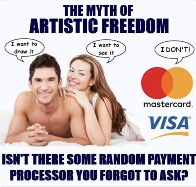 >>151698302I’ve seen a few artists get upset with Patreon’s rules and then they had to shift to subscribestar.Gumroad wad an option that was recently nuked. Pixiv and DLSite got fucked and now people have to go through extra loops just to buy things.And considering earlier this year with what happened to Steam, these websites really are at the mercy of credit card companies. All of this does not make porn drawing a secure choice.