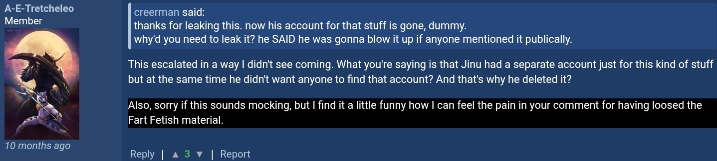 >>151705176From what I remember (rumor) it was the other RP'er who leaked it, I think he did it because he had a guilty conscience. Jinu is still around only behind paywalls(check kemono) even though he said he was getting help for his porn addiction. Whats hilarious is that a couple months before this leaked he was caught with an alt called JinxSeptic that did anal fart blowjobs and toilet clogging hyperscat.