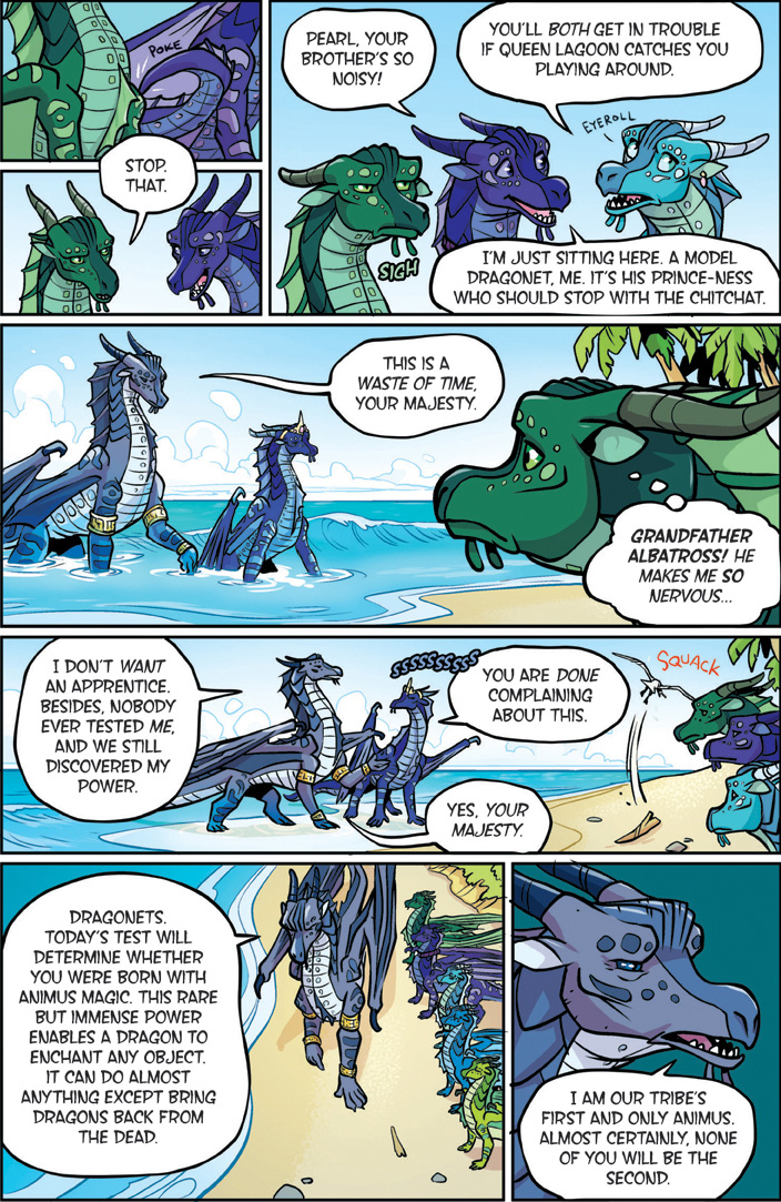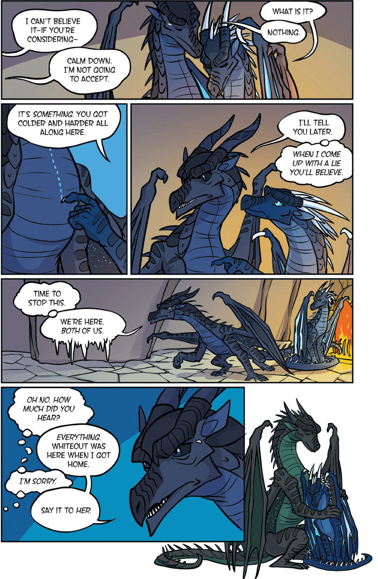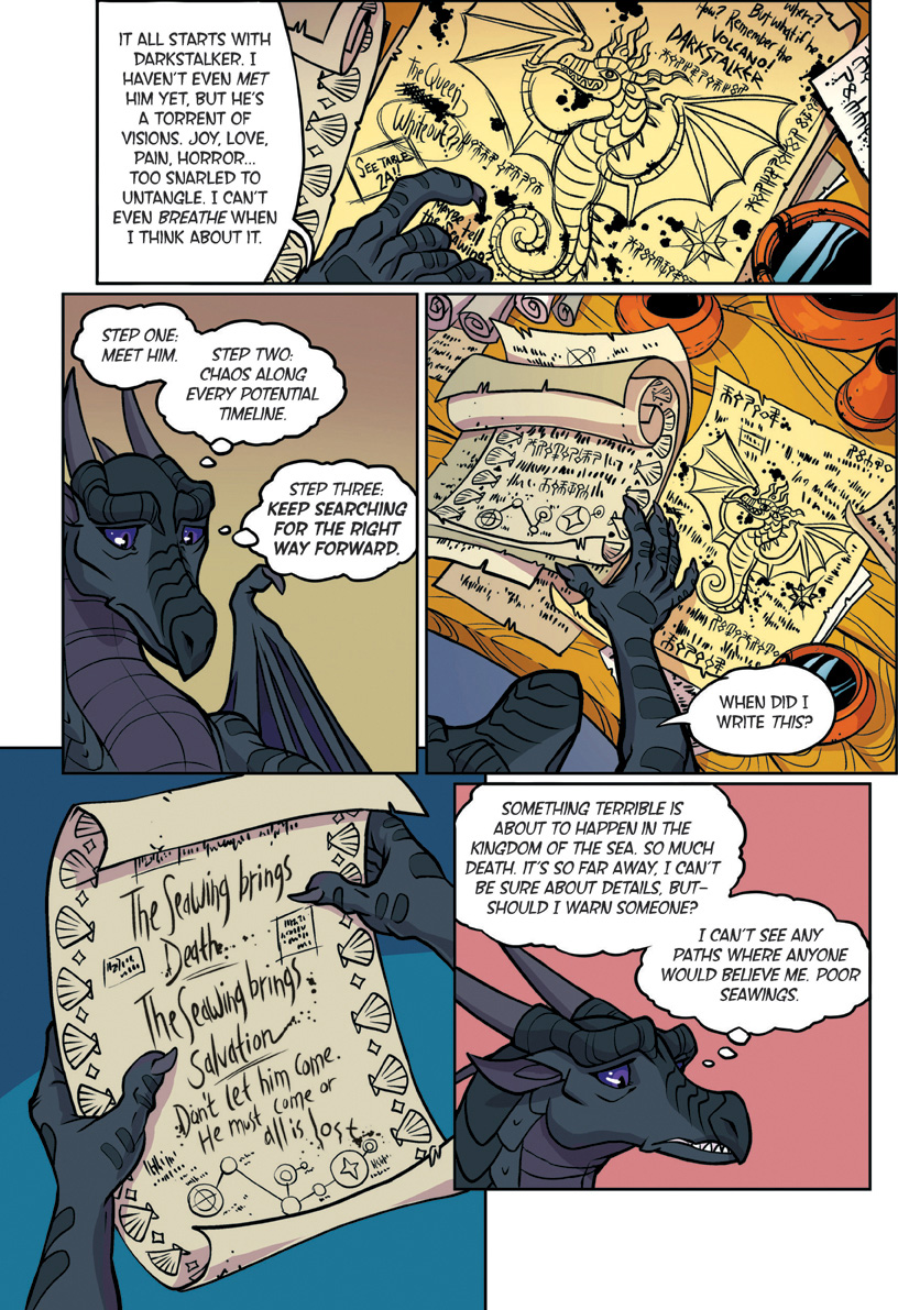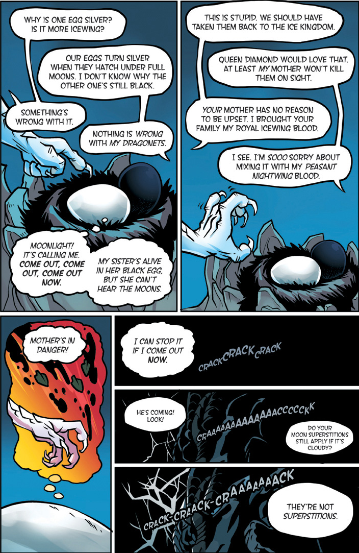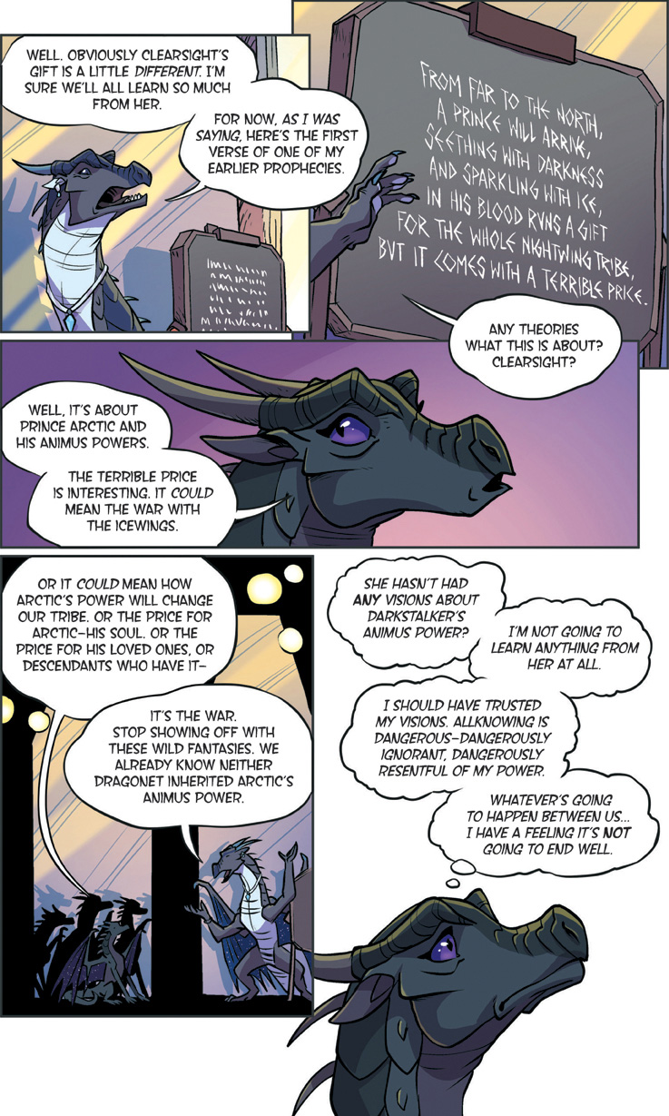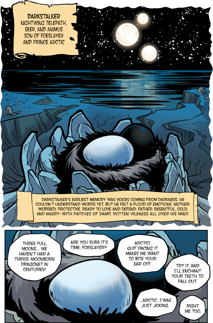 Also known as "The YA dragon books/comics for kids to young to remember what warrior cats was." Well we're here. This is a big one. Darkstalker is something of a big deal as WoF books go. Widely considered the 'best' book of the series with three POVs for a mid-arc prequel dropped before the Talons of power which by some good juggling on the WoF team's part is set to release right after this. The art is by one Jake Parker who was brought in since Mike has his plate full doing the main series. But enough prattling about the Scavengers, this is Darkstalker, and now you get to experience it as a comic.THREE DRAGONS. ONE DESTINY.THIS IS THE BEGINNING... OF THE END...In the SeaWing kingdom, a young prince learns he is an animus capable of wonderful magic that comes with a terrible price.In the mind of a Nightwing dragonet, a thousand futures unfold and almost all of them, she knows, lead to disaster and destruction.And under three full moons and the watchful eyes of his NightWing mother and IceWing father, the most powerful dragon Pyrhhia will ever know is clawing his way out of his egg: Darkstalker, the dragon who will change the world forever.Long before the SandWing war, lifetimes before the Dragonet Prophecy. darkness is born.>-Quote on BackcoverRegular words of introduction do not suffice for...DARKSTALKERhttps://www.youtube.com/watch?v=EUcrFKHMZ-k>Thread 1: "The dragonet prophecy" https://desuarchive.org/co/thread/129855279/>Thread 2: "The Lost Heir" https://desuarchive.org/co/thread/129890926/>Thread 3: "The Hidden Kingdomhttps://desuarchive.org/co/thread/129925480/>Thread 4: "The Dark Secret"https://desuarchive.org/co/thread/129954043/>Thread 5: "The Brightest Night" https://desuarchive.org/co/thread/129972905/>Thread 6: "Moon Rising"https://desuarchive.org/co/thread/134713773/>Thread 7: "Winter Turning"https://desuarchive.org/co/thread/141669409/>Thread 8: "Escaping peril"https://desuarchive.org/co/thread/146924673/