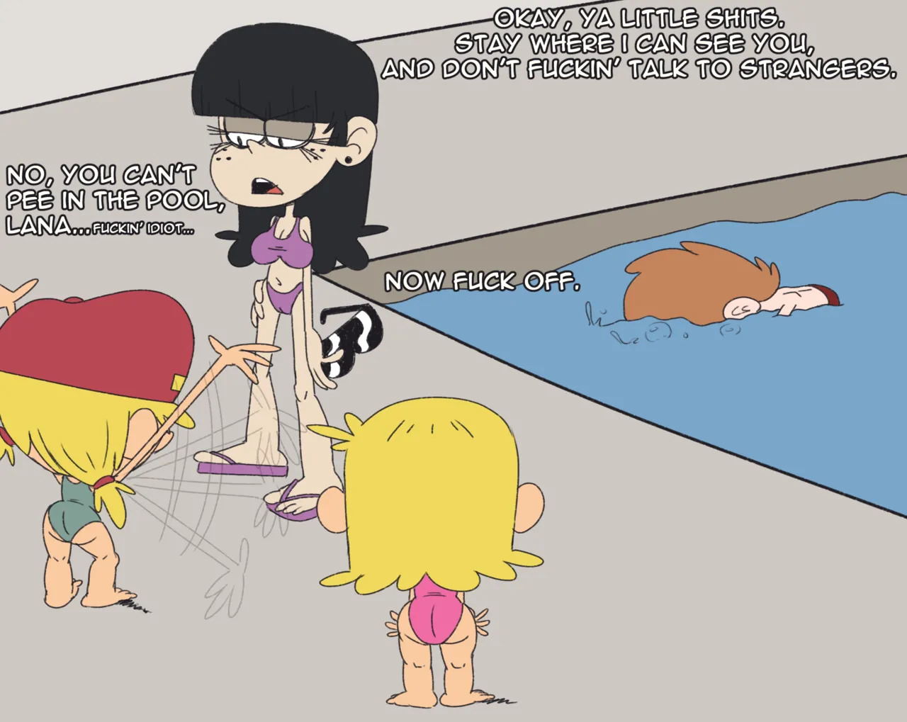 >>151731490Thread after that archived so don't know if you saw this one:Lori, Lincoln, and Bobby three-way in their swimsuits in the backyard pool.