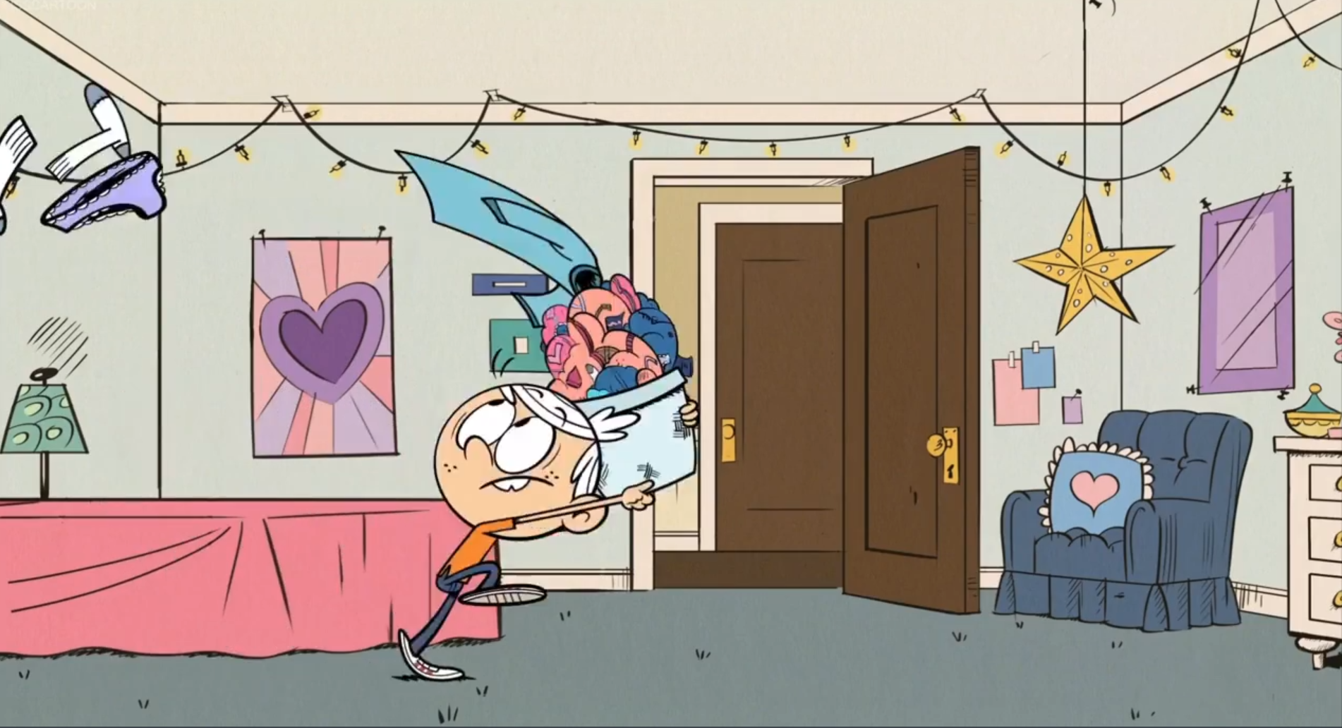 >>151717432In Driving Miss Hazy you can see some of Lori's underwear in her laundry. She tosses this purple pair in the basket while lincoln's holding it.