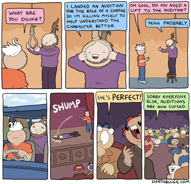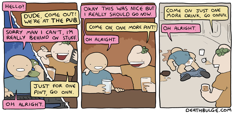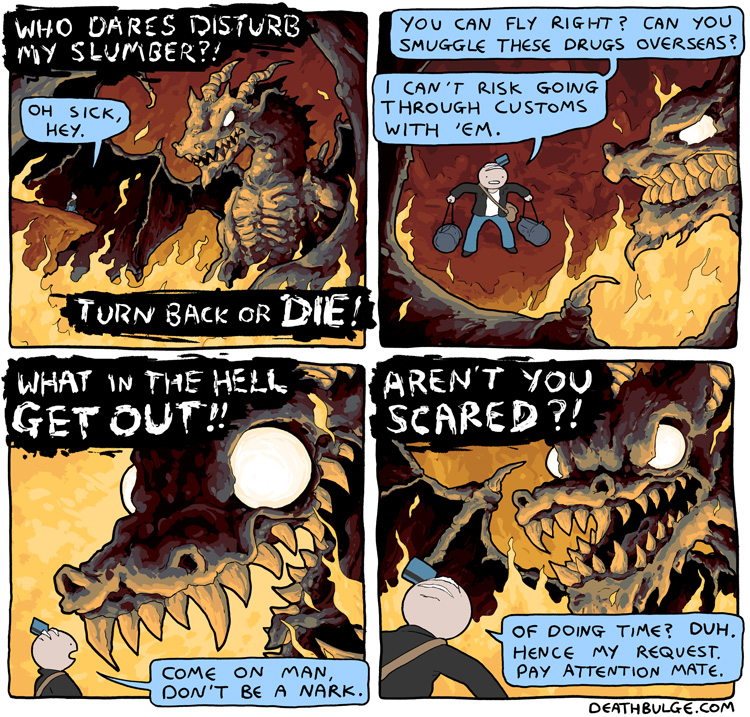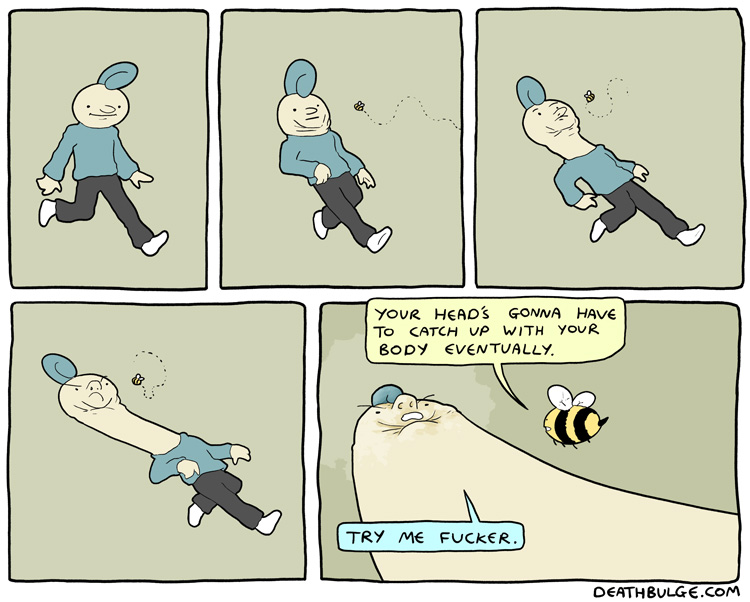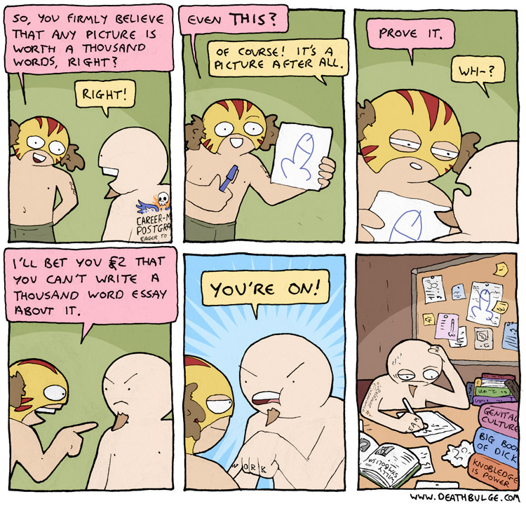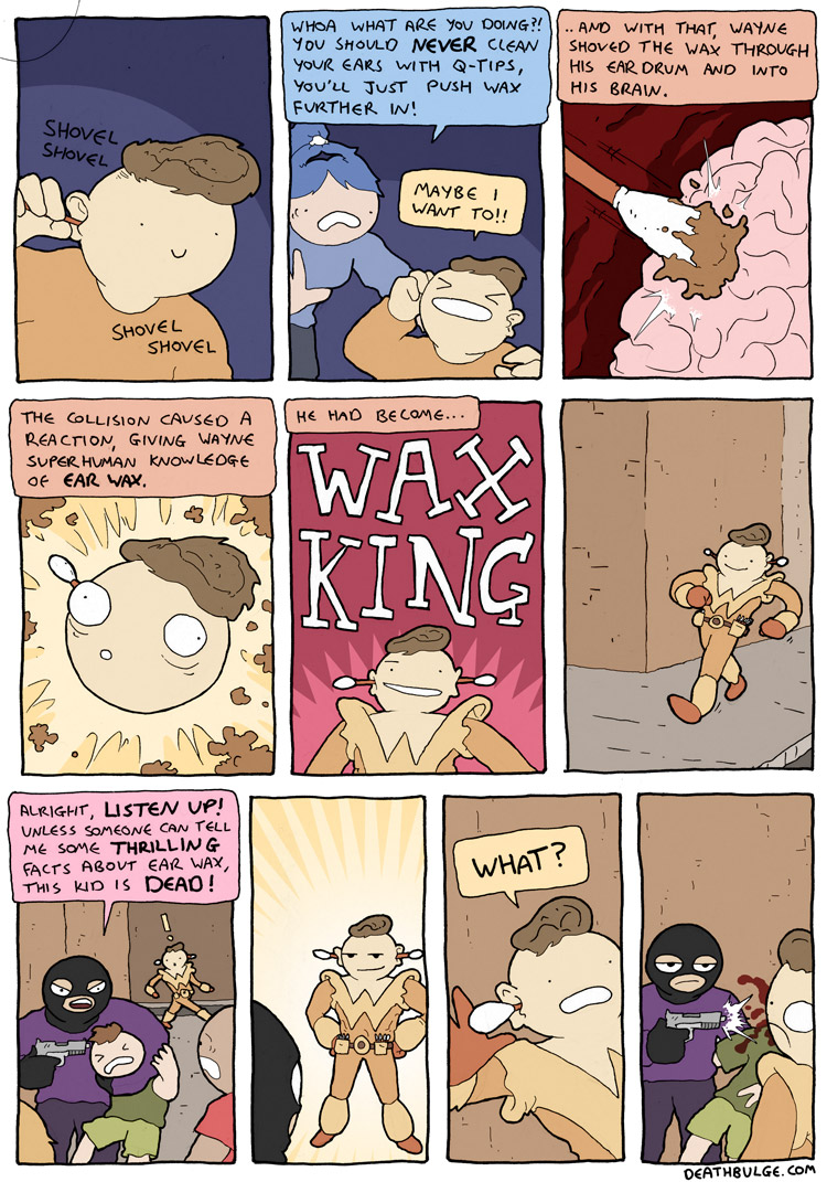 alt text:>That's how I passed my exams. I would put textbooks on the end of q-tips and ram them through my head. It works, you should definitely try it and then sue me for talking you into it and then you can enjoy a new series of Deathbulge comics about me being bankrupt and selling Ian the Fisherman's fishing rods behind his back to afford bare essentials.