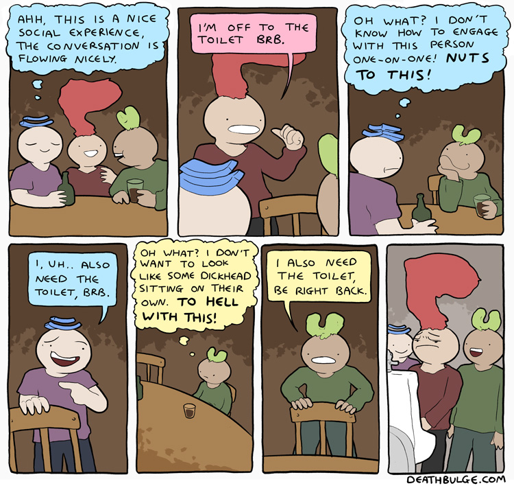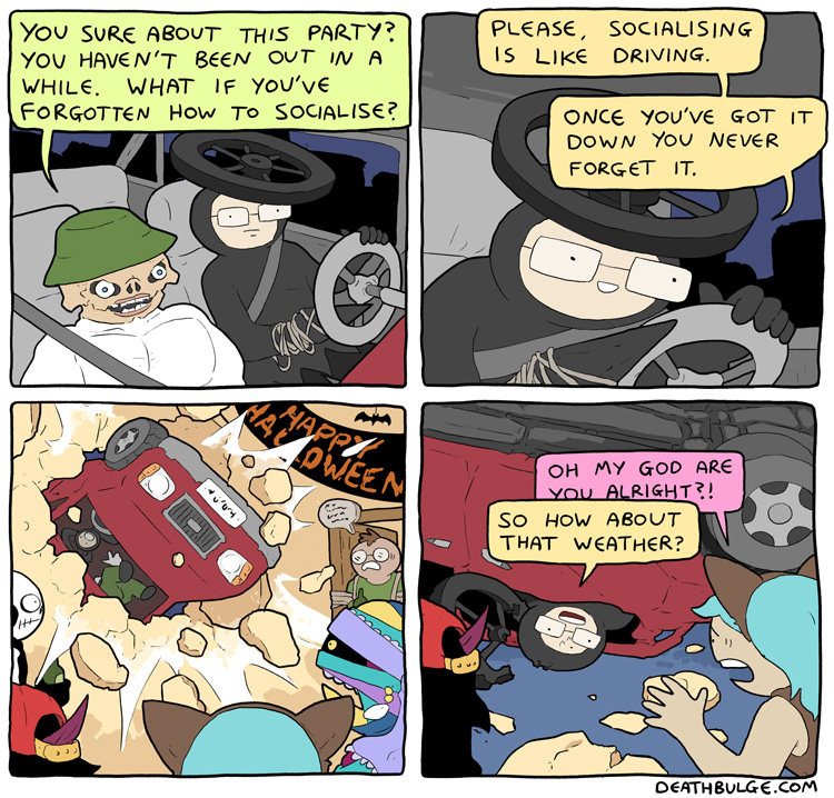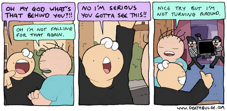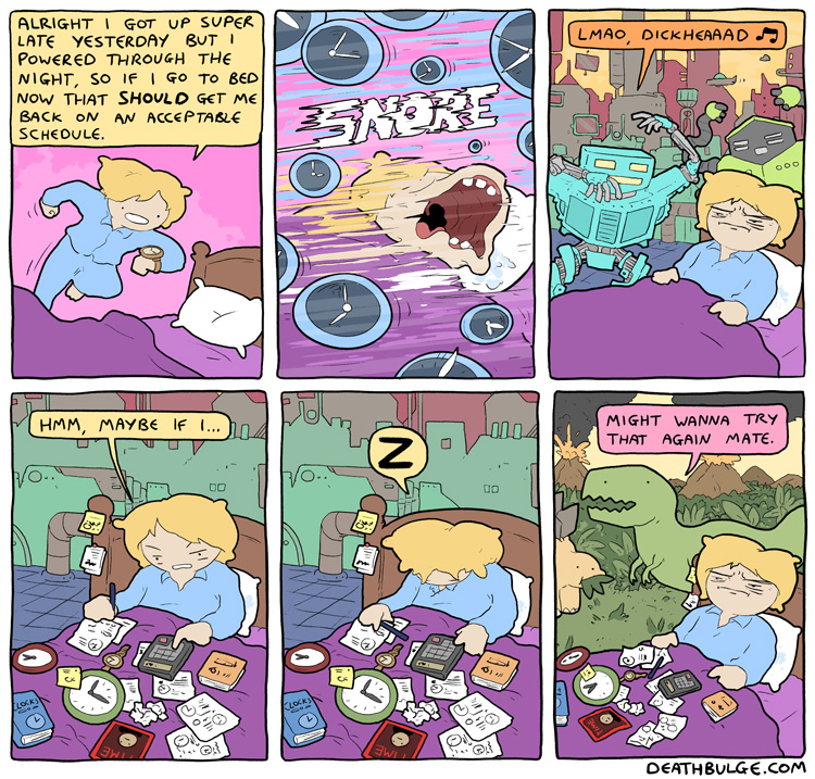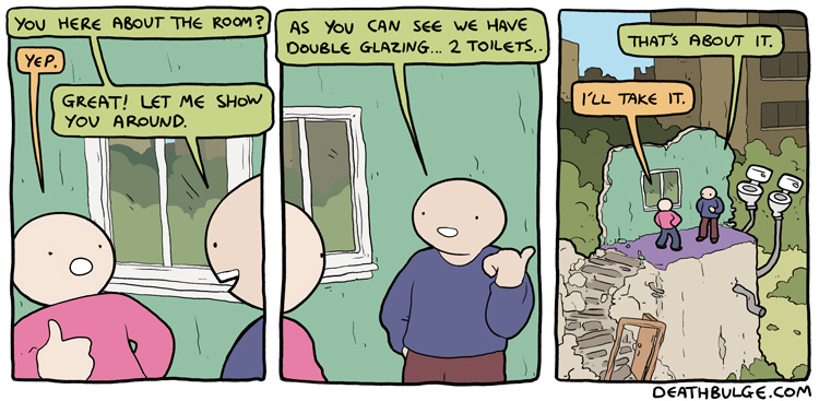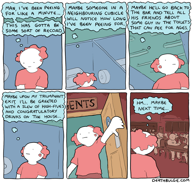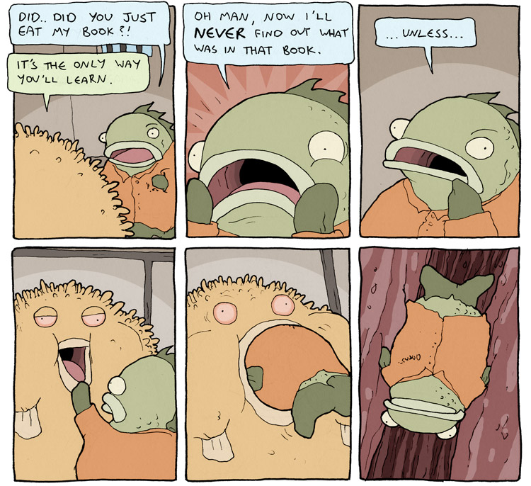alt text:>That's how I passed my exams. I would put textbooks on the end of q-tips and ram them through my head. It works, you should definitely try it and then sue me for talking you into it and then you can enjoy a new series of Deathbulge comics about me being bankrupt and selling Ian the Fisherman's fishing rods behind his back to afford bare essentials.