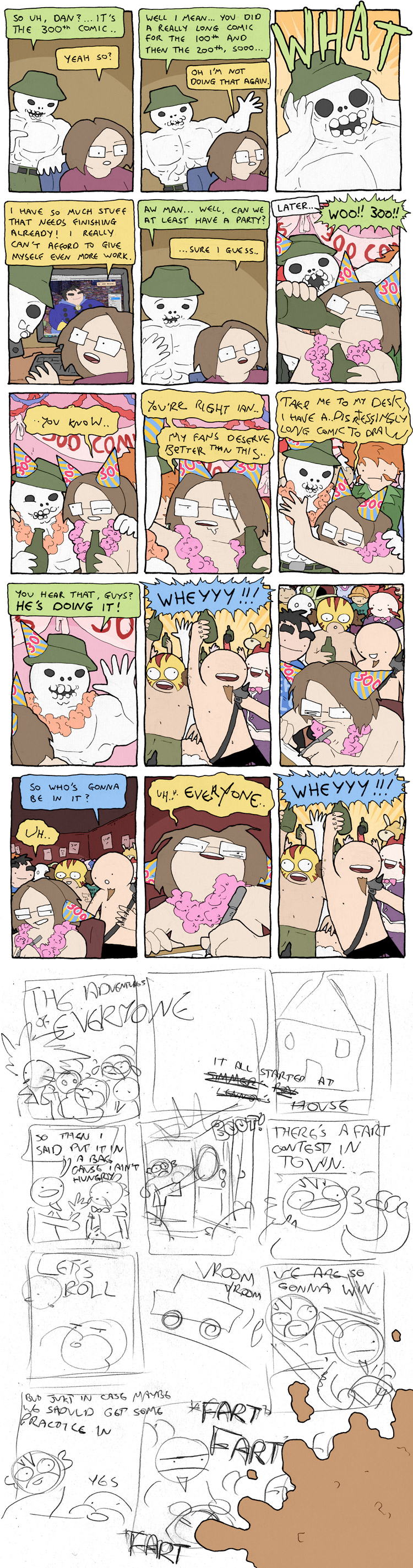 Unlike the 100th and 200th comics they didnt have an extra long strip for the 300th. So Im actually able to post the full thing this time.anyways, here's the alt text:>Was Dan naked at the party or just shirtless? I guess we'll never know.