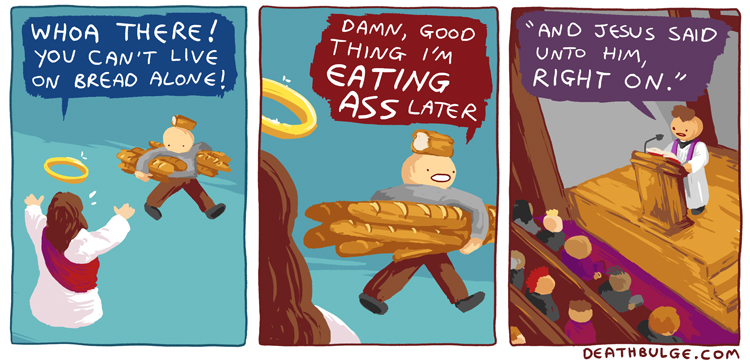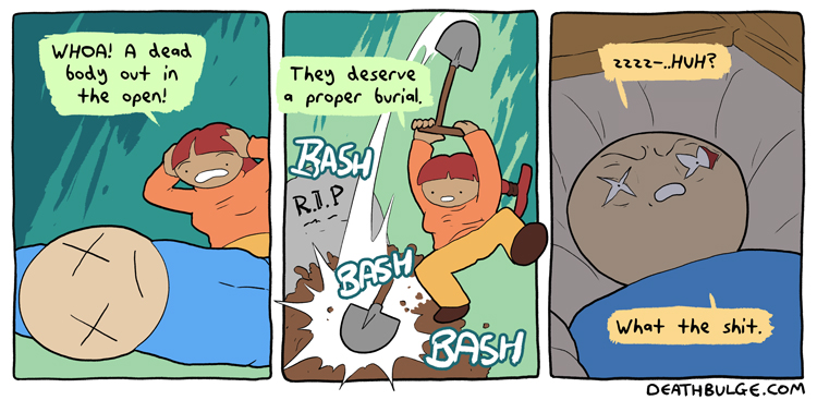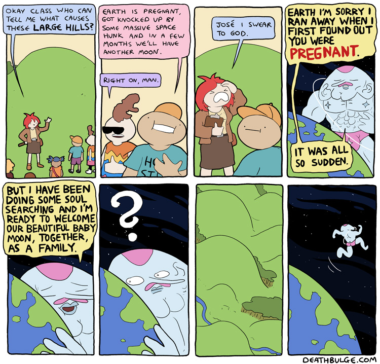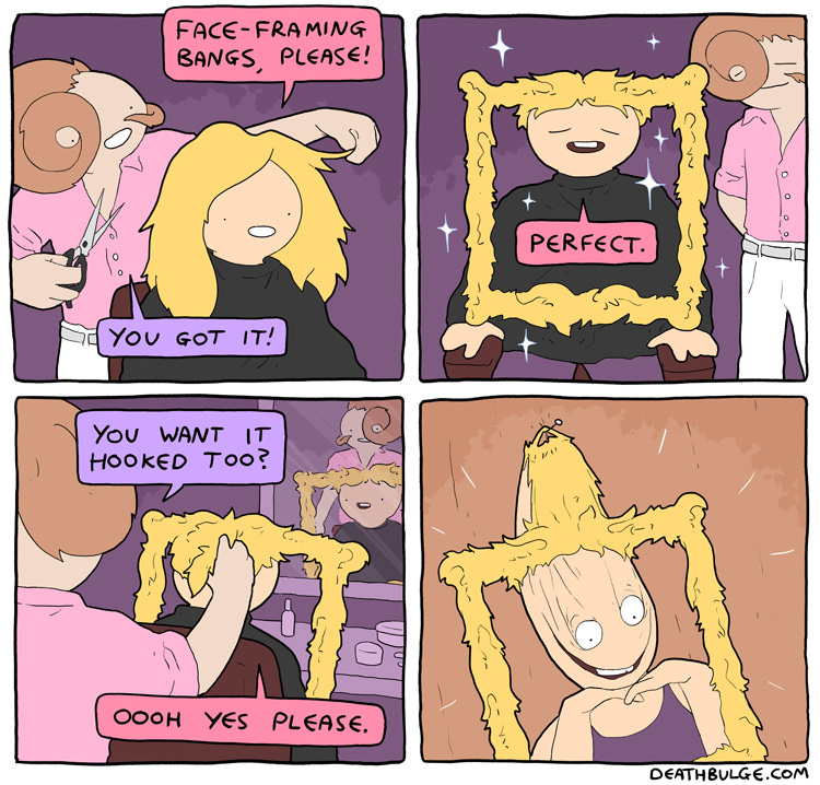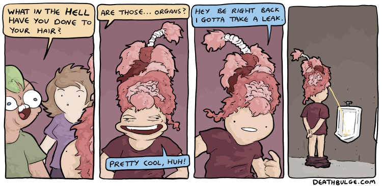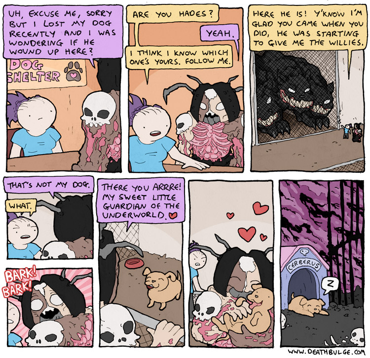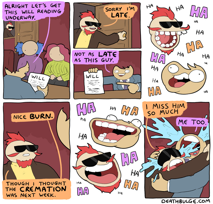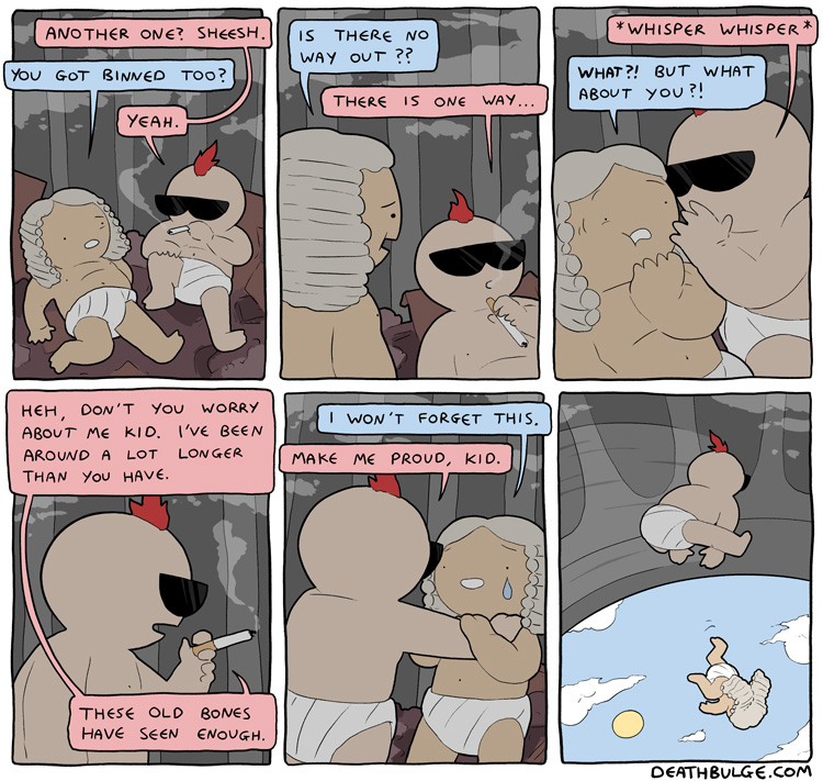 Deathbulge is a mostly gag-a-day comic. It started off following a band named deathbulge, but they only show up occasionally now.Link to the website: https://www.deathbulge.com/comics/1https://deathbulge.com/archiveMostly irrelevant cast page: https://deathbulge.com/aboutPrevious thread: >>151703031I hit bump limit so I made a new one.https://deathbulge.com/comics/298alt text:>There's nothing quite like seeing God slam dunk someone straight through all 9 circles of hell.