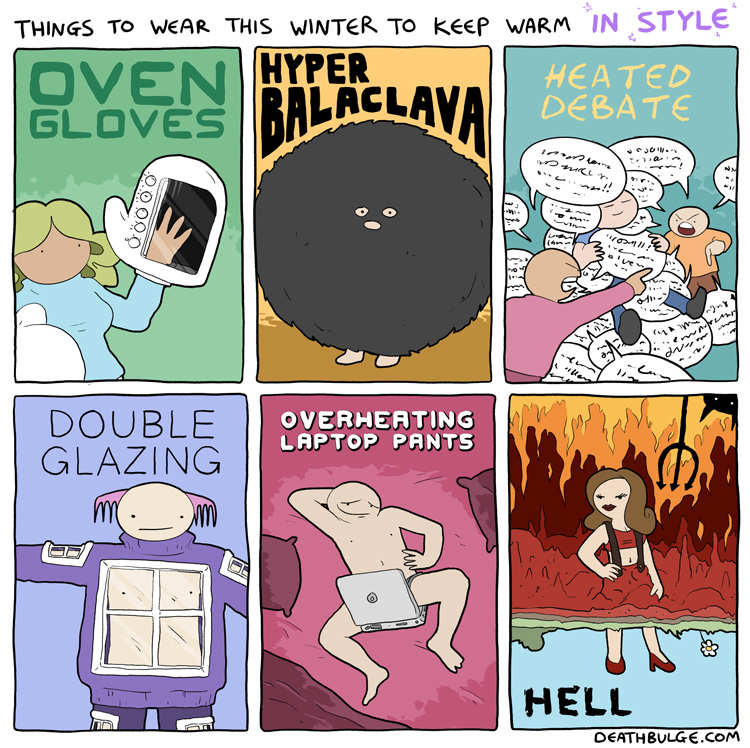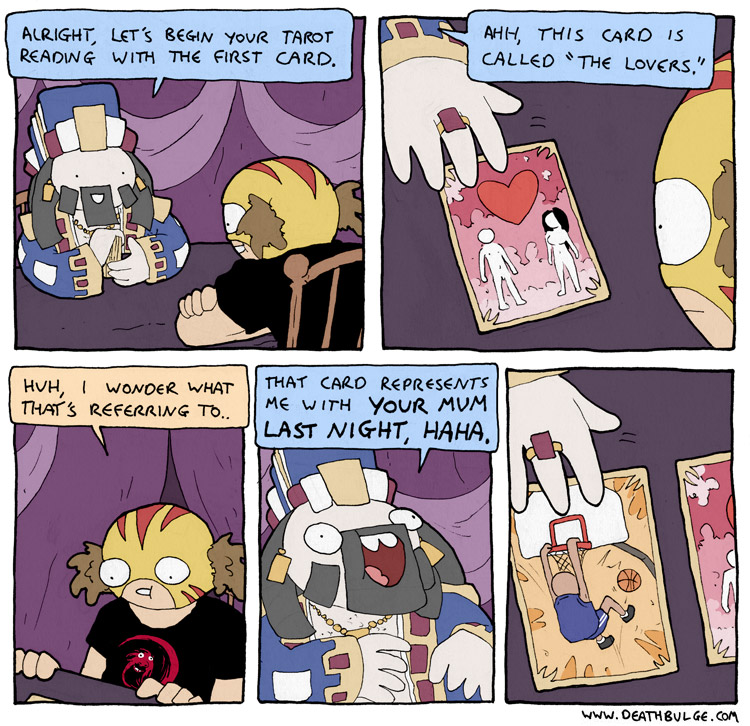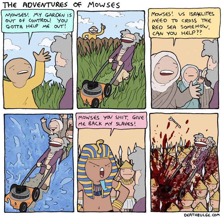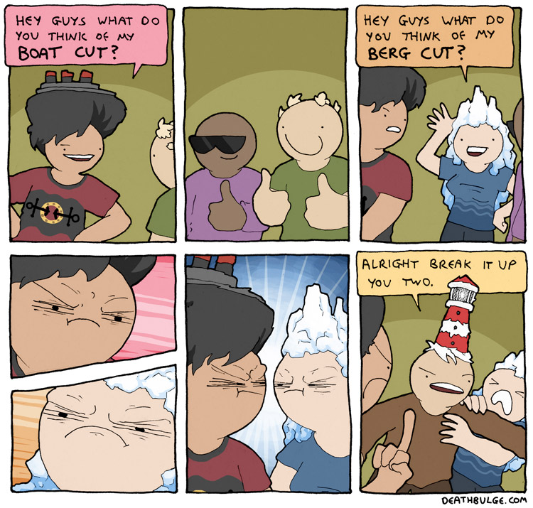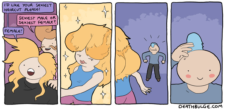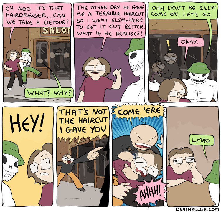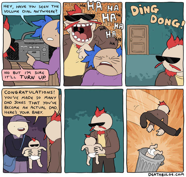 Deathbulge is a mostly gag-a-day comic. It started off following a band named deathbulge, but they only show up occasionally now.Link to the website: https://www.deathbulge.com/comics/1https://deathbulge.com/archiveMostly irrelevant cast page: https://deathbulge.com/aboutPrevious thread: >>151703031I hit bump limit so I made a new one.https://deathbulge.com/comics/298alt text:>There's nothing quite like seeing God slam dunk someone straight through all 9 circles of hell.