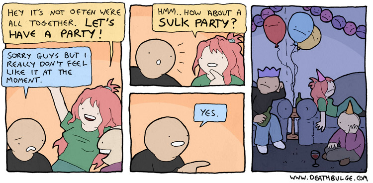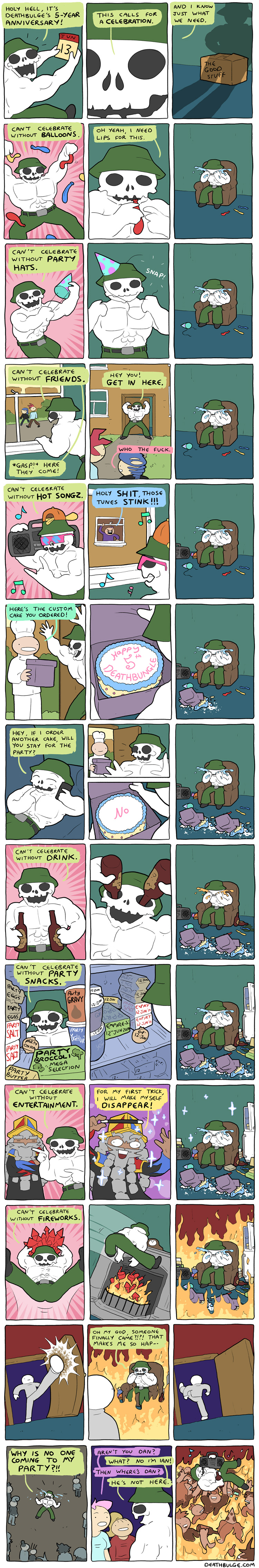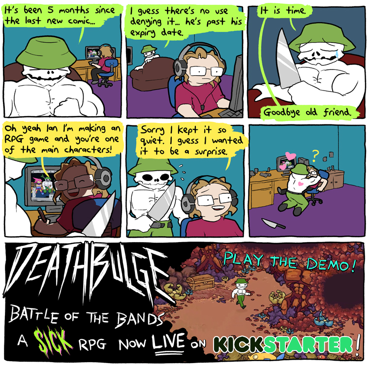 This current strip was from a little over ten years ago. The index page on the website says it was published in september 2015. anyways, the alt text:>Yeah, this woulda been the perfect opportunity to have a comic featuring the whole Deathbulge band actually doing actual band stuff but that would ruin everything.