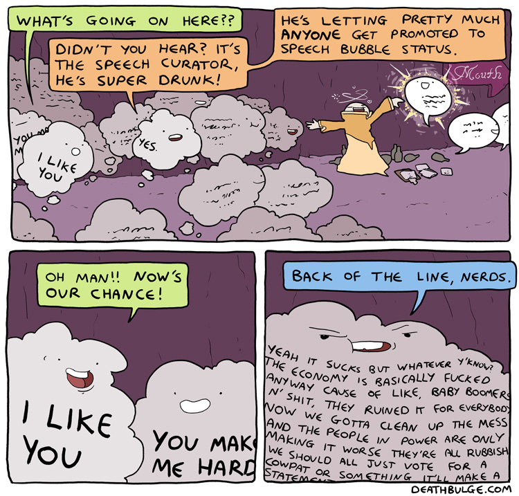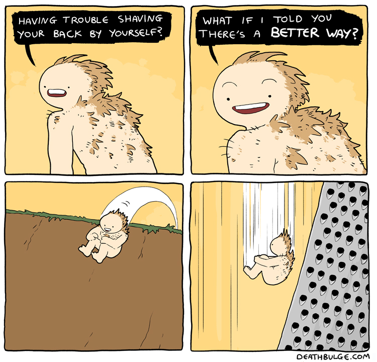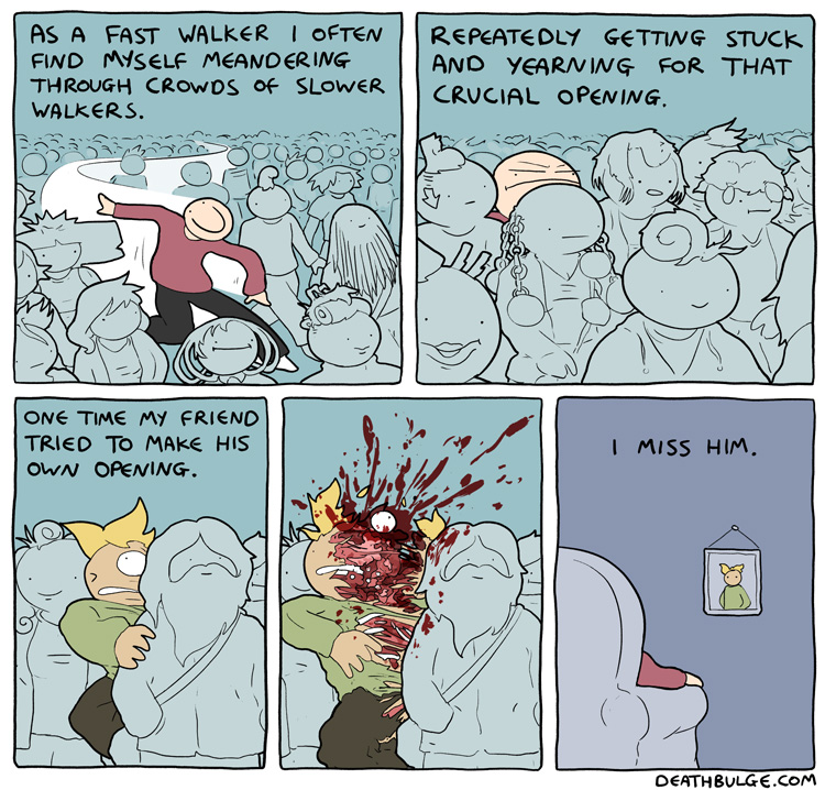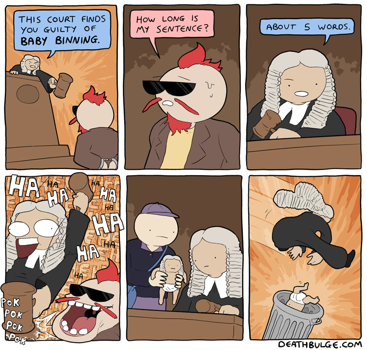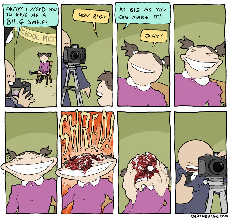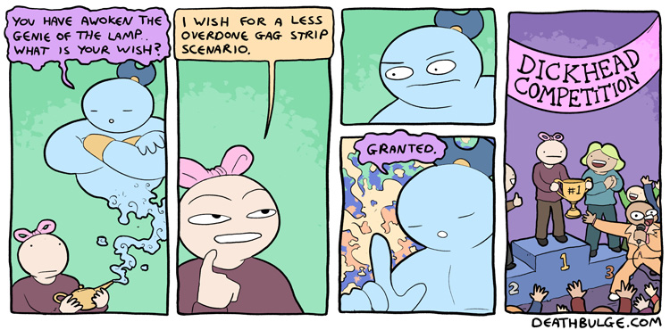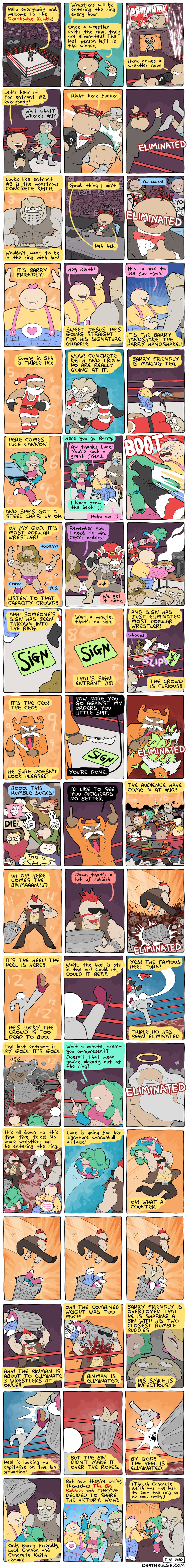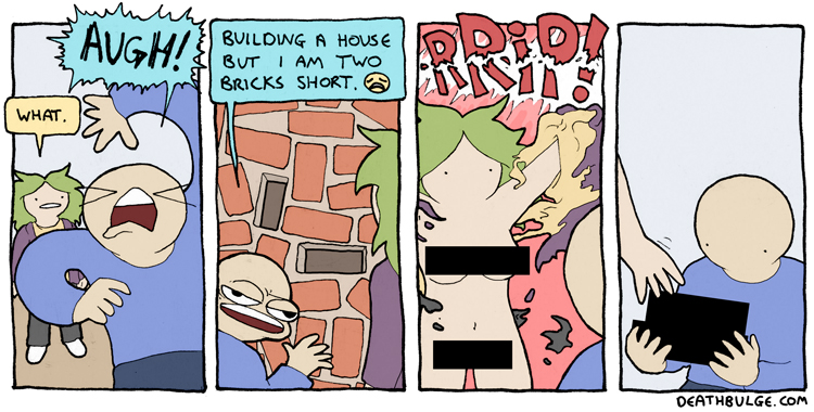 I had to chop this one up because it was originally 1 file on the website and the file size was too large to upload here. It may have also been too long (at 750×9612 ) but Im not sure what the file dimension limits are.Its probably easier to just view it on the website:https://deathbulge.com/comics/411alt text:>Alright here's the 411th comic, folks. Say some gangsta is dissin' ya sporadic updates. You just give 'em one of these.