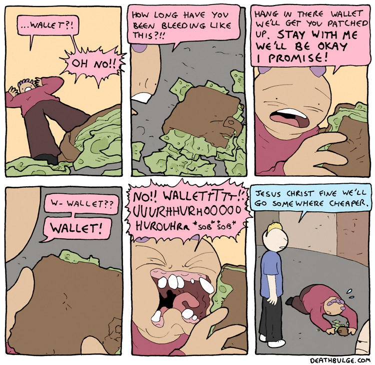 alt text:>Fortunately he had wallet life insurance. Though that meant that in claiming, the wallet was no longer dead so he couldn't claim so then it died again and basically wallet life insurance is a very confusing experience and you shouldn't get involved.