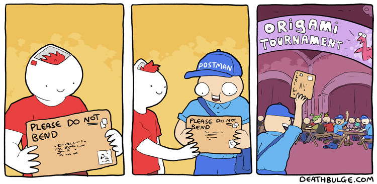 >Most people don't think this happens to their packages but that's because later in the day the postmen usually continue on to the Ironing Out Creases Competition.