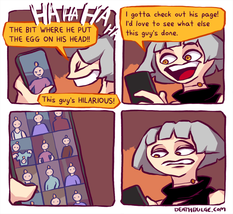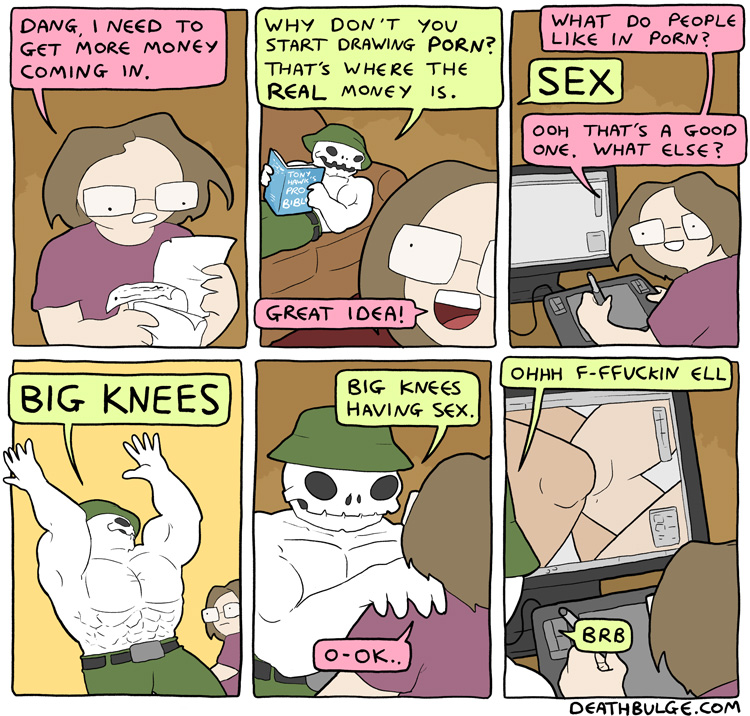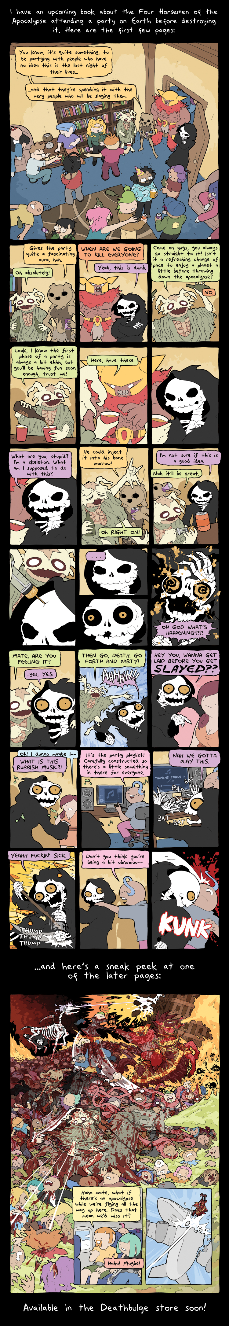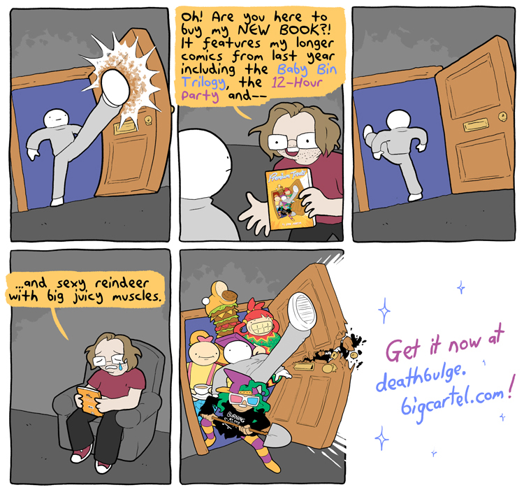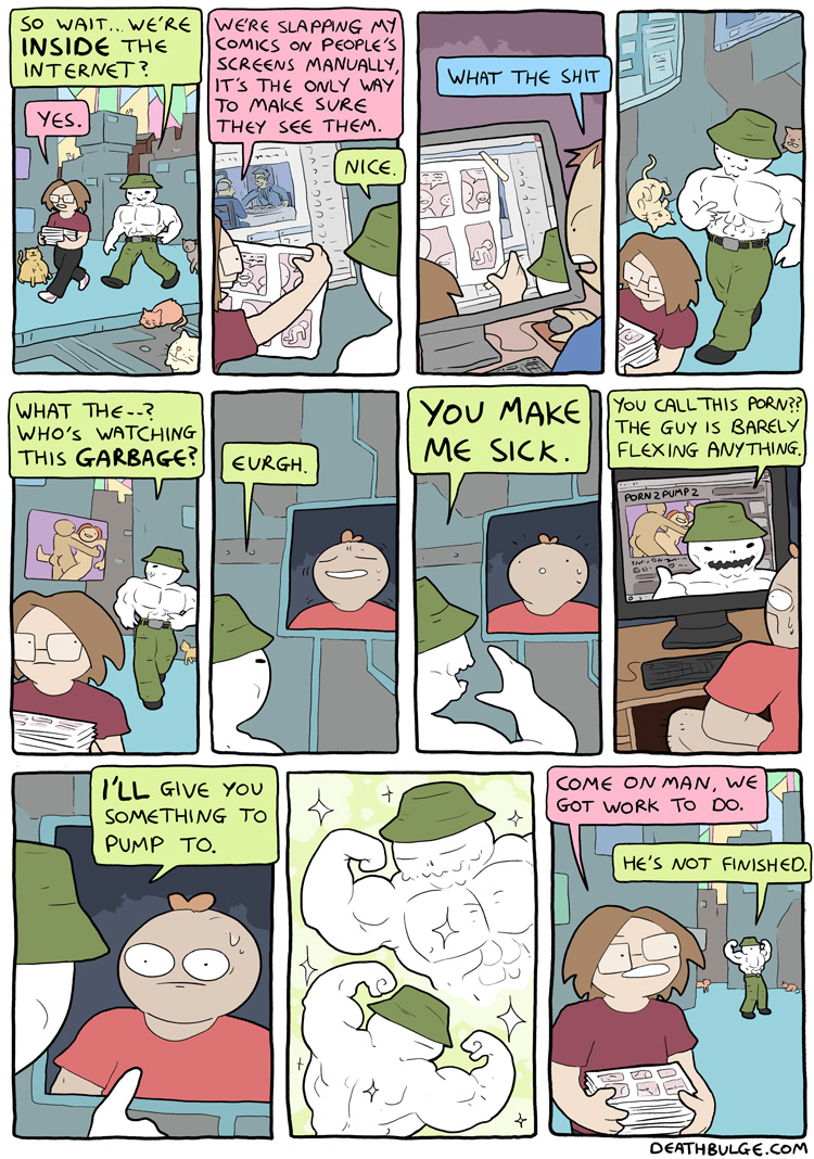This ones a promo for comic book he made.It's not in the bigcartel shop anymore though: https://deathbulge.bigcartel.com/So I don't know how one would buy it. Seems like he had other out of print books as well.Anyways, alt text:>Just in case you guys were beginning to wonder if I was slacking on the comics front. I AM SO NOT.