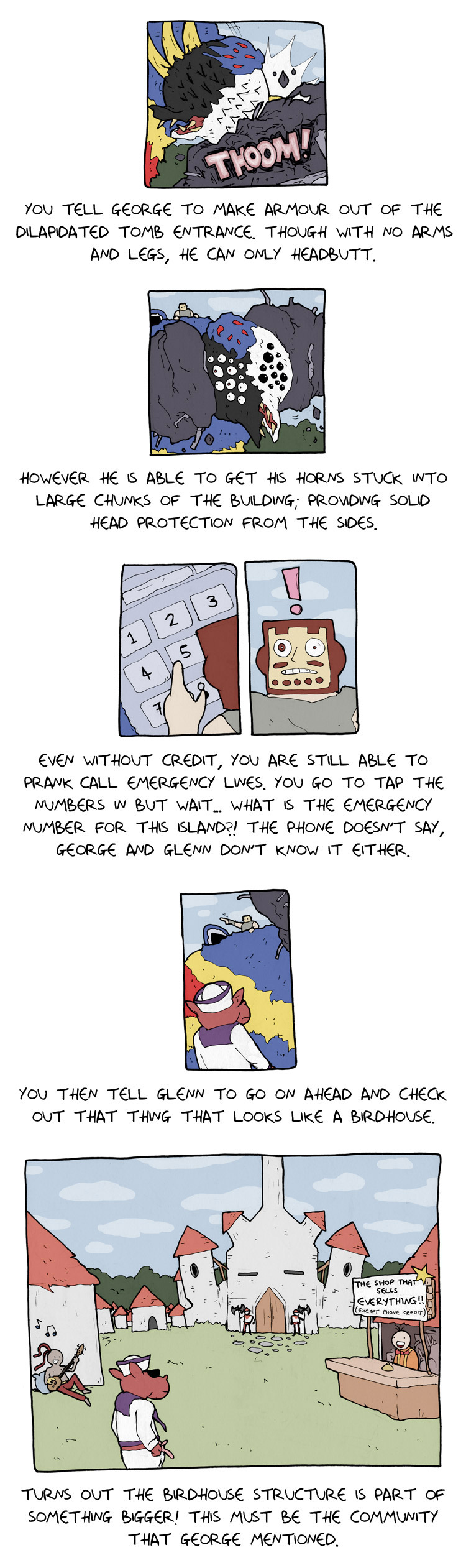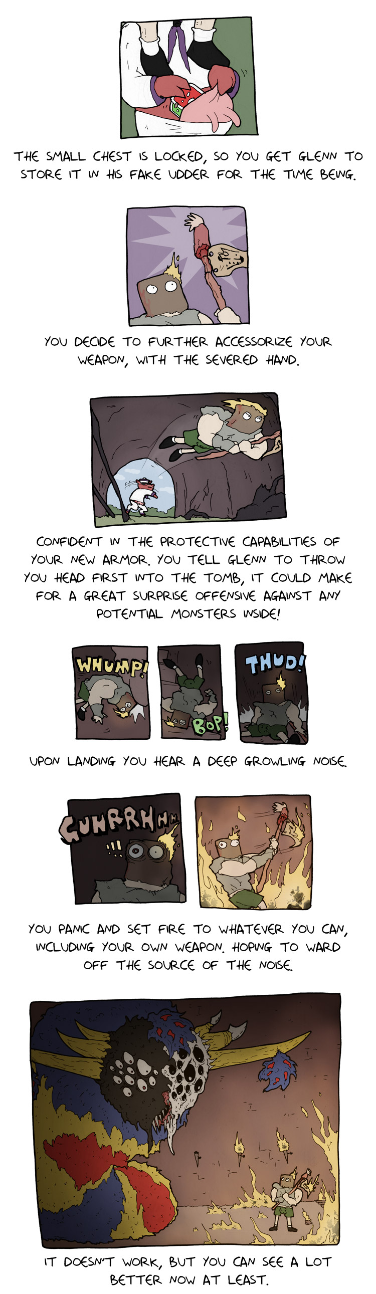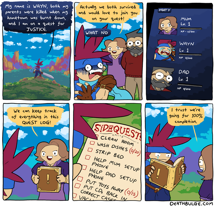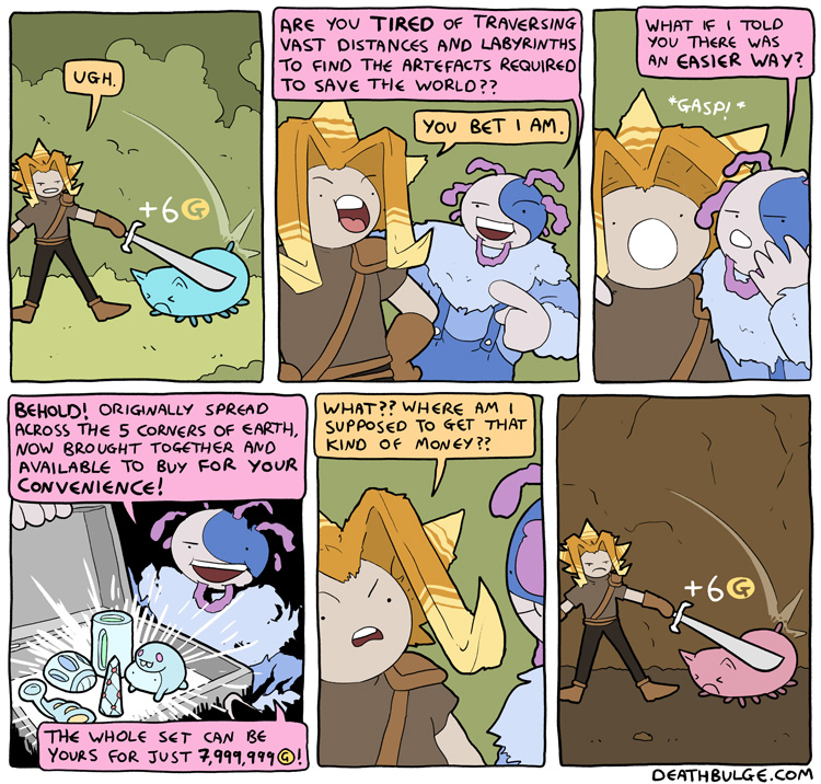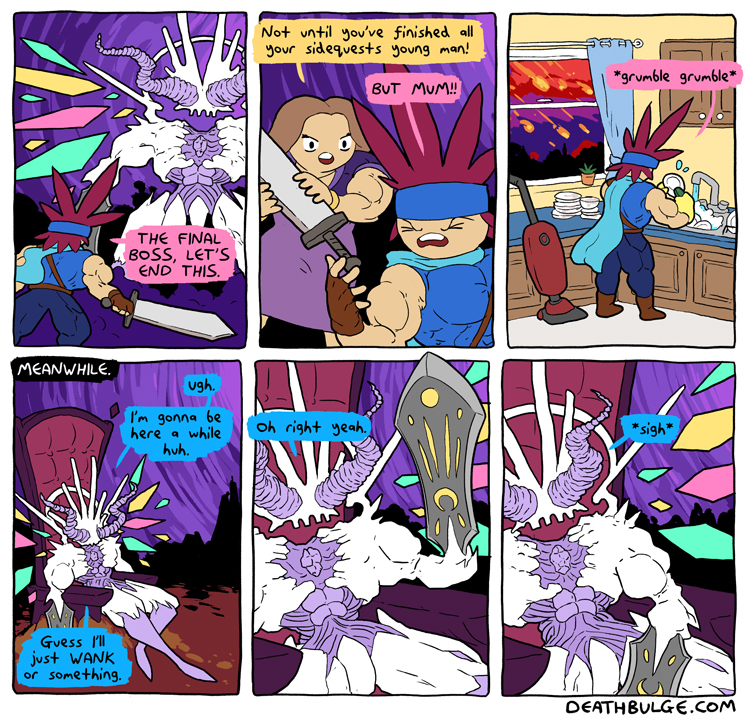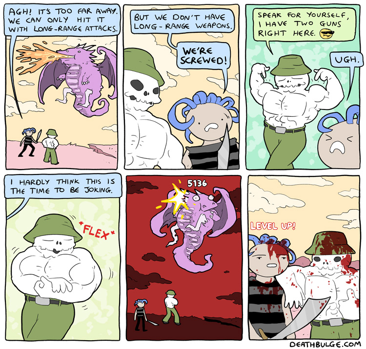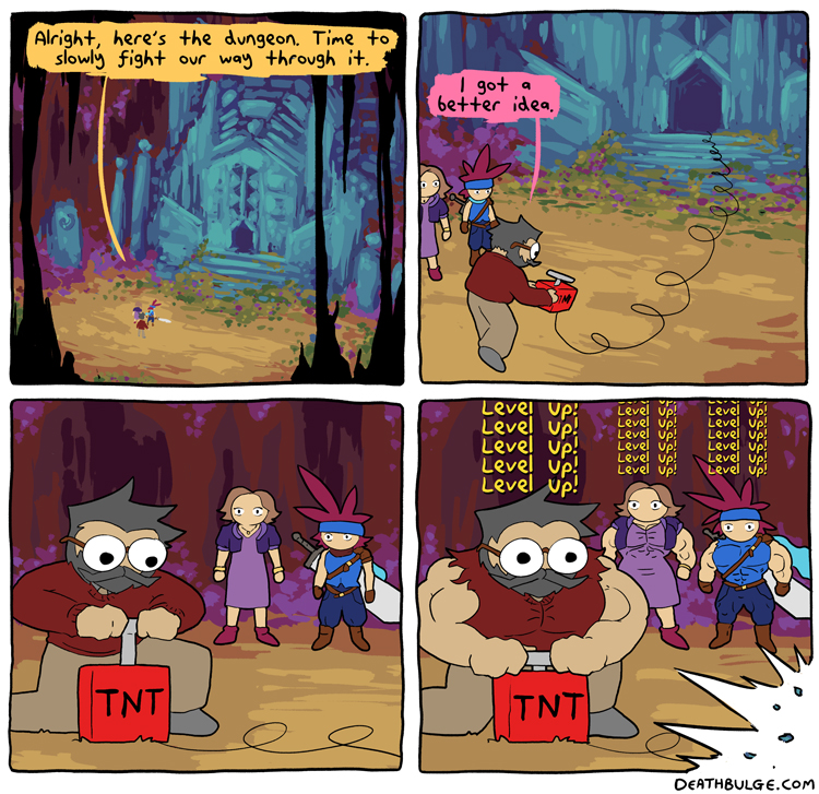 Alt text:>Yeah yeah, there's always exceptions, I mean look no further than the game in the 2nd panel, not the most thrilling gameplay, is it?This one came out on the first of this month. And thats all the comics there currently are, at least on the main part of the website.There was a user interactive side comic involving one of the deathbulge band members and some other comics on his twitter and/or bsky. Idk if I'll post those laterhttps://x.com/deathbulgehttps://bsky.app/profile/deathbulge.bsky.social