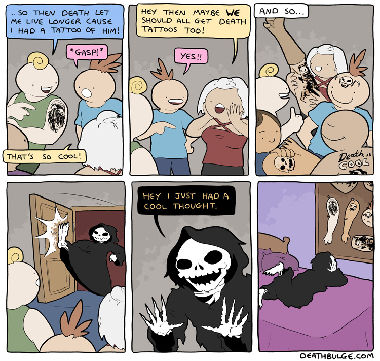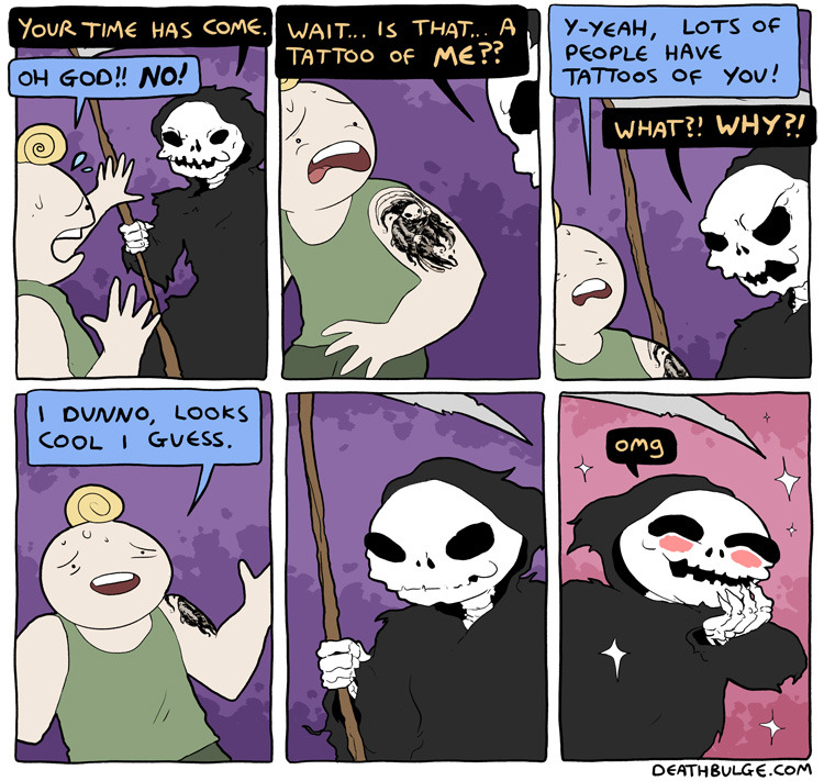 >Long ago during his teenage years Death briefly considered getting a tattoo of a human but then realised that humans look totally stupid and not cool at all.