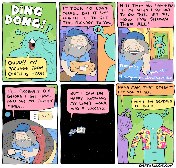 >Note: Postman died on the way back to his home planet.