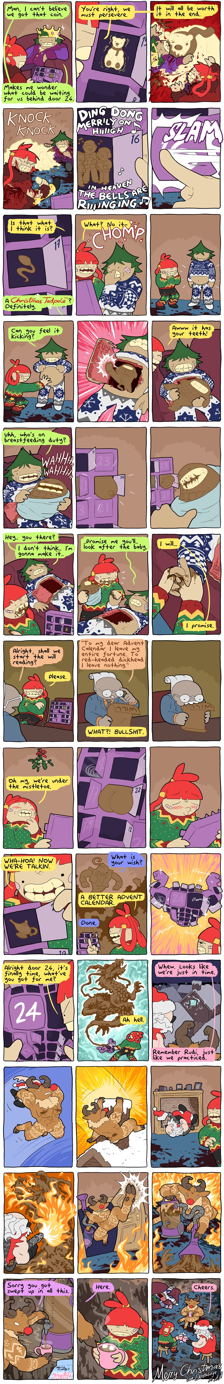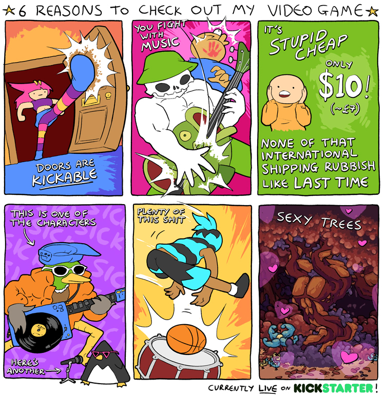 This one is the other comic of 2019 and the last comic till 2023.Like the previous one it's basically just talking about the kickstarter he was doing for his game.alt text:>Bonus Reason 7: The soundtrack is FUCKING SICK, all credit goes to Leslie Wai and Patrick Henaghan for being so stupidly talented.