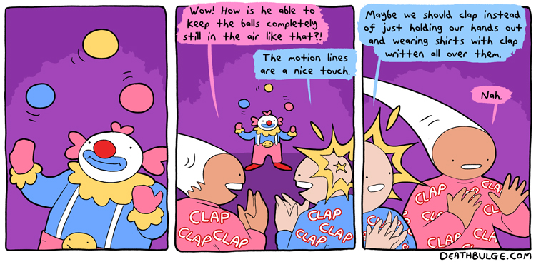 >Everytime the clown honks his horn another clown comes out and starts aggressively hurling musical notes at everybody.