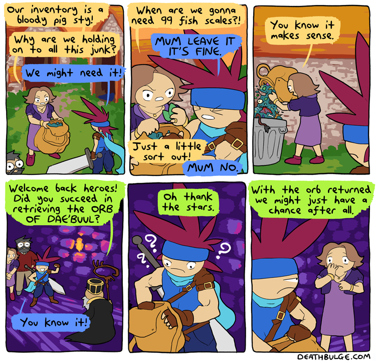>>151721505alt text:>'Honey I'm sorry... but isn't the bag so much lighter now? Plus we don't have to rummage around so much to find the potions!' 'BUT MUM YOU DISCARDED A KEY ITEM. YOU'VE MADE IT IMPOSSIBLE TO PROGRESS, WE'RE GONNA HAVE TO RESTART THE WHOLE ADVENTURE.' 'Don't snap at your mother, son.'