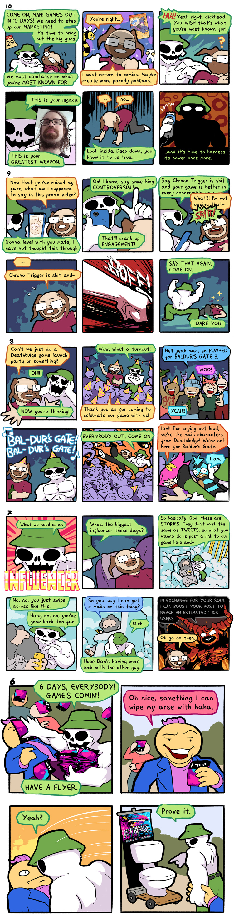 After nearly 5 years we have the first comic of 2023. It came out july 29th, 10 days before his game (as shown in the first panel). It's kinda a promo for his game, but there's clearly jokes here too.It also was too large for me to upload in the original file size being over 4 MB, so I had to chop it into 2 files.You can also view it on the website if you want: https://deathbulge.com/comics/435alt text:>If you're reading this, that means I uploaded the comic properly, which is great cause I haven't done it in almost half a decade and my memory is FOGGY. This better work.
