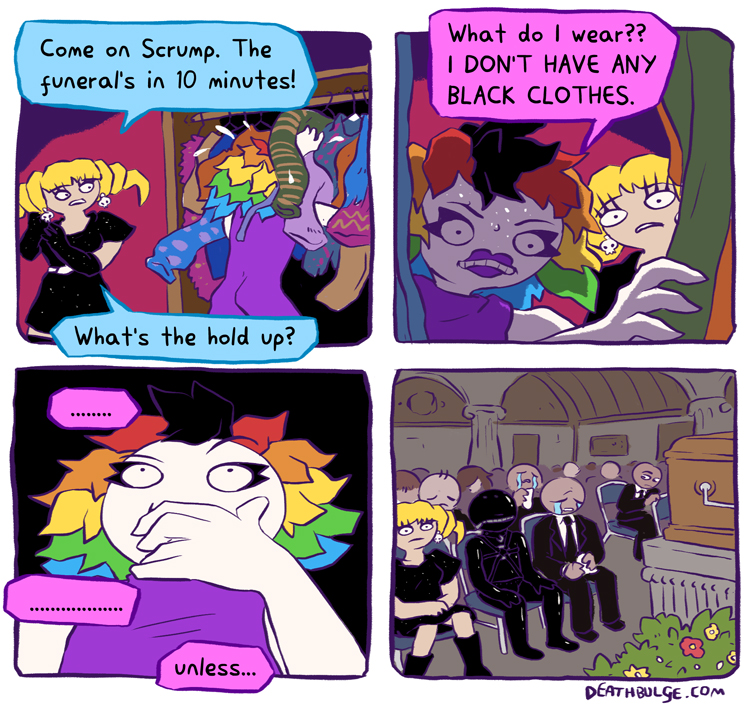 first comic of 2025. The art style is a little bit different.alt text:>Not a bad shout to be honest. After all, the whole point of gimp suits is to wear them when a session of pain is expected, and surely mourning comes under the pain umbrella. Albeit that's more about emotional pain than physical. So maybe an emotional gimp suit would be more appropriate, whatever the hell that looks like. Also thanks for still visiting this site even though it's been a total graveyard for years. It's really nice to know my lack of output didn't render me immediately forgotten.