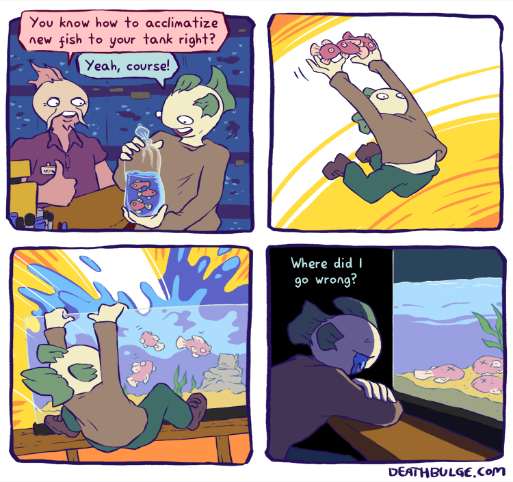>Classic beginner mistake. You're supposed to put the sealed bag in the tank for 30 minutes and THEN dunk them into the water with your bare hands. A lesson learned for next time.