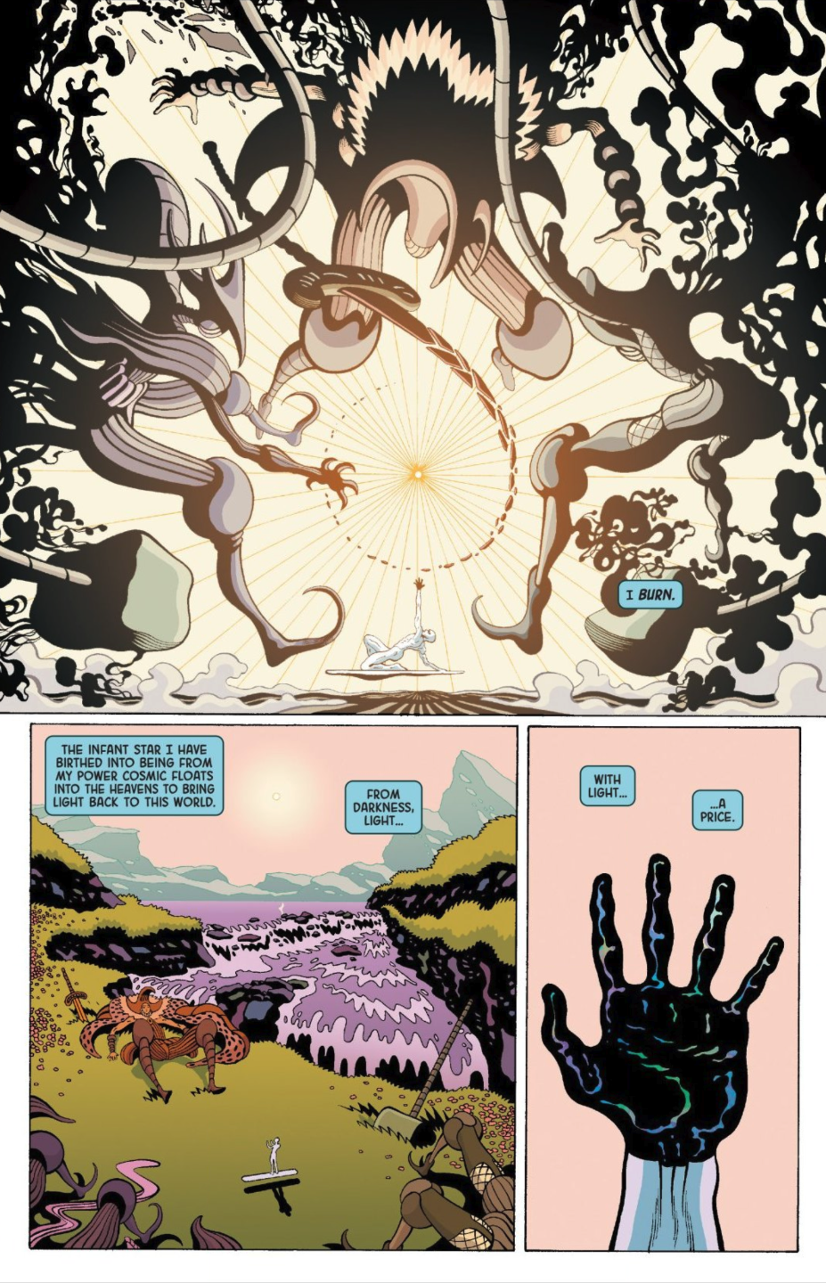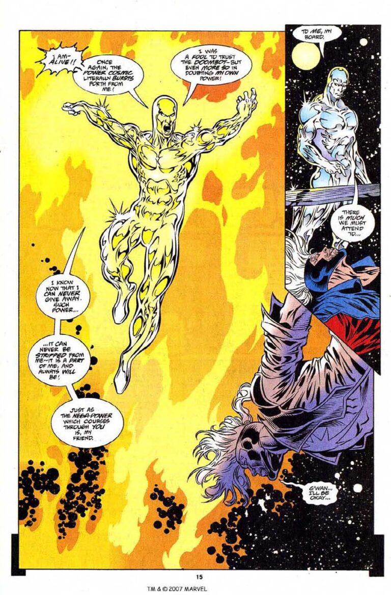 >>151728591That's how he saves (well, insures the creation) of his homeworld. To beat Knull, he fired a sun off. Which he had been doing throughout the comic. See pic related. See the comic is called Silver Surfer Black. That's referring to how, in his weakened state, every time he fires a sun, another part of his body turns black. And since he's trapped in a primordial universe where not much life exists, he can't recharge his power cosmic. So it's treated as a weapon he has limited ammo for.But notice that even after he gets the power to make a life seed from Ego, he STILL says he only had enough energy to fire off one more sun. Implying he was still in a weakened state compared to his normal self.